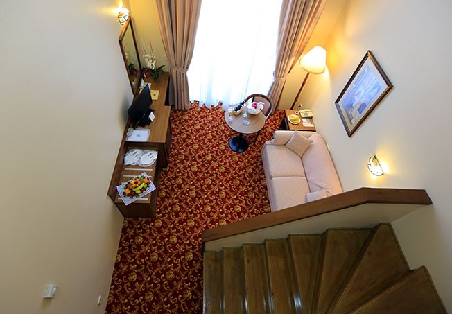Площадь · 35 м² · имеющих внутри лестницу · 2 ванные комнаты (на первом этаже – ванна, на втором – душ) и туалет · кровать · ванная комната · ЖК-телевизор · кондиционер · телефон · фен · сейф · мини-бар · балкон · ковровое покрытие пола