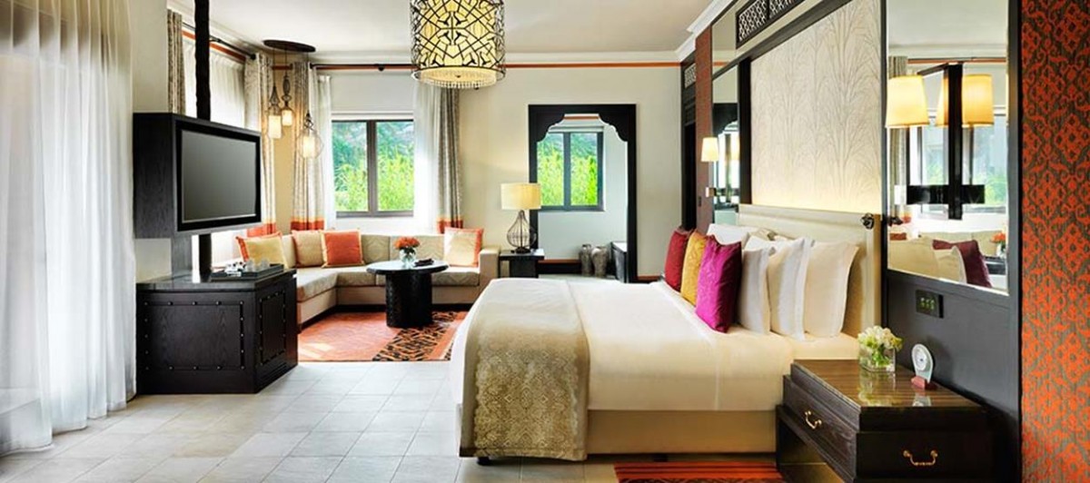 Площадь · 60 квадратных метров • Вид из номера · Изумительный вид на живописные сады курорта, извилистые тропинки в тени многолетних растений, традиционные арабские башни или умиротворяющий вид на водные каналы, по которым снуют маленькие лодочки под названием «абра» • Размещение · 2 взрослых и 2 детей в возрасте до 12 лет или 3 взрослых • Кровати · 1 кровать King Size • Дополнительные удобства · Все необходимое для приготовления чая и кофе в номере · Бесплатная ежедневная газета · Гладильная доска и утюг · Сейф · Фен · Минибар · Детская кроватка (по запросу)