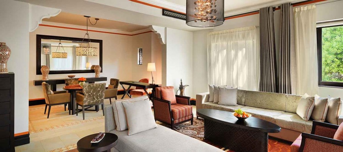 Площадь · 644 квадратных метров • Вид из номера · Изумительный вид на живописные сады курорта, извилистые тропинки в тени многолетних растений, традиционные арабские башни или умиротворяющий вид на водные каналы, по которым снуют маленькие лодочки под названием «абра» • Размещение · 4 взрослых и 2 детей в возрасте до 12 лет • Кровати · 1 кровать King Size и 2 кровати Twin Size • Дополнительные удобства · Все необходимое для приготовления чая и кофе в номере · Бесплатная ежедневная газета · Гладильная доска и утюг · Сейф · Фен · Минибар · Детская кроватка (по запросу)