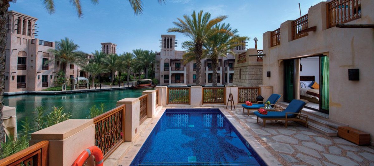 Площадь · 370 — 531 квадратных метров • Вид из номера · Изумительный вид на живописные сады курорта, извилистые тропинки в тени многолетних растений, традиционные арабские башни или умиротворяющий вид на водные каналы, по которым снуют маленькие лодочки под названием «абра» • Размещение · 6 взрослых и 2 детей в возрасте до 12 лет • Кровати · 2 кровати King Size и 2 кровати Twin Size • Дополнительные удобства · Все необходимое для приготовления чая и кофе в номере · Бесплатная ежедневная газета · Гладильная доска и утюг · Сейф · Фен · Минибар · Детская кроватка (по запросу)