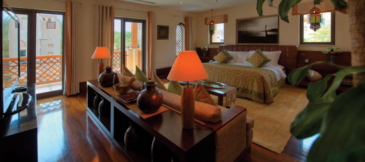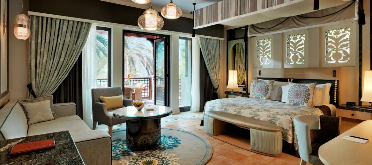 Площадь · 120 квадратных метров • Вид из номера · Изумительный вид на живописные сады курорта, извилистые тропинки в тени многолетних растений, традиционные арабские башни или умиротворяющий вид на водные каналы, по которым снуют маленькие лодочки под названием «абра» • Размещение · 2 взрослых и 2 детей в возрасте до 12 лет или 3 взрослых • Кровати · 1 кровать King Size • Дополнительные удобства · Все необходимое для приготовления чая и кофе в номере · Бесплатная ежедневная газета · Гладильная доска и утюг · Сейф · Фен · Минибар · Детская кроватка (по запросу)