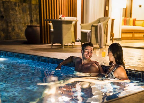 Площадь · 64 квадратных метров • Расположены на пляже • Терраса с открытым персональным бассейном и обеденной зоной на открытом воздухе • Гостиная • Спальня с кроватью king-size • Ванная комната с ванной и душем с функцией «тропический дождь» • DVD-плеер • Аудиосистема Bose • Телевизор, Wi-Fi доступ в Интернет • Сейф • Мини-бар • Винный холодильник • Оборудование для приготовления чая • Кофемашина Nespresso