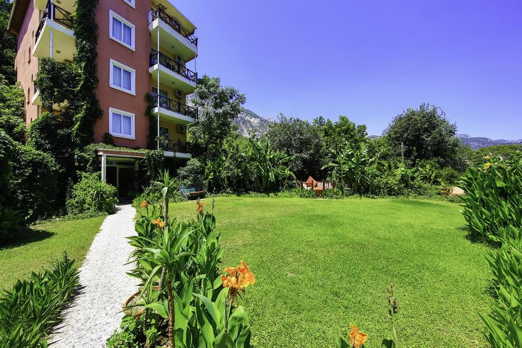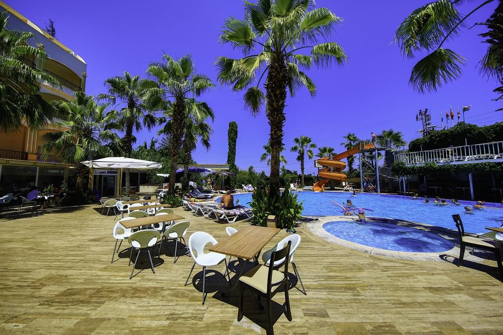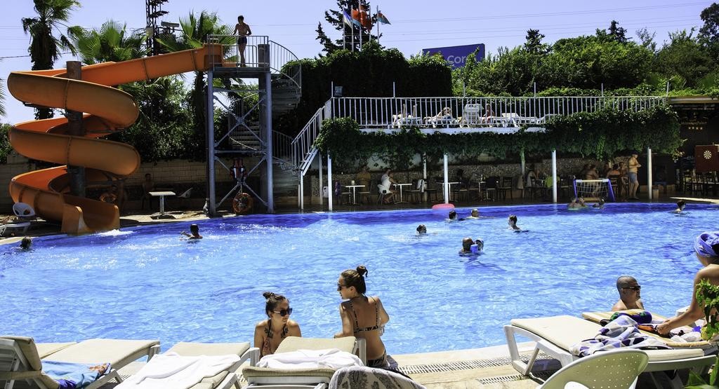 Территория отеля очень маленькая, ухоженная и чистая. На клочке земли удалось разместить бассейн, который притягивает детей водной горкой. Рядышком около уютных беседок с подушками находится игровой сектор с качелями — детки всегда на виду у родителей.