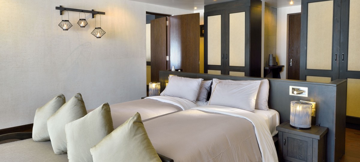 Площадь · 200 квадратных метров • Образуется при объединении двух вилл категории Sunset beach villa • Расположены рядом с рестораном и детским клубом • Кондиционер • Вентилятор • Спутниковое телевидение • Стереосистема • DVD-плеер • Wi-Fi доступ в Интернет • Док-станция для iPod • Сейф • Мини-бар • Оборудование для приготовления чая и кофе