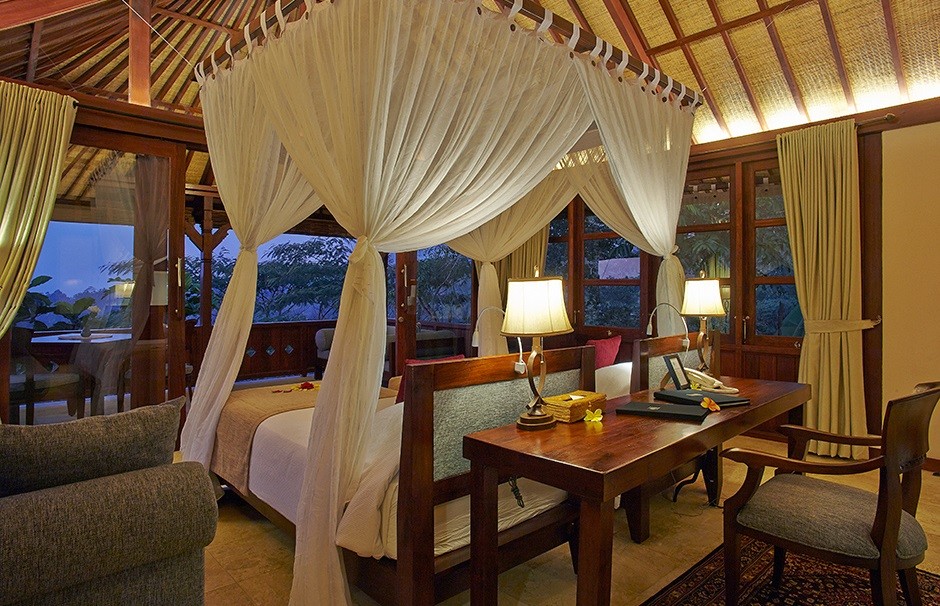 Гости могут отведать блюда индонезийской кухни в ресторане-баре Surya, из которого открывается вид на долину реки, сады и гору Агунг.