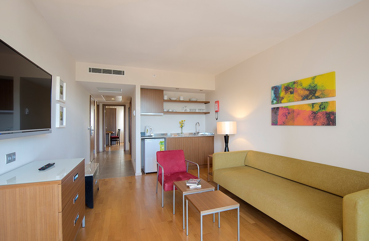 Площадь · 45-50м2 · с видом на море · 2 спальни · ламинированные полы · система центрального кондиционирования · телефон · ванная комната · душ · халат · тапочки · фен · Wi-Fi ТВ · мини-бар set - up (белое вино, красное вино, Cola, Diet Cola, Cola Zero, Fanta, Sprite, пиво, холодный чай, Сода, соки, вафли) · различные закуски во время пребывания (сухофрукты, крекеры, макароны и т. Д.)