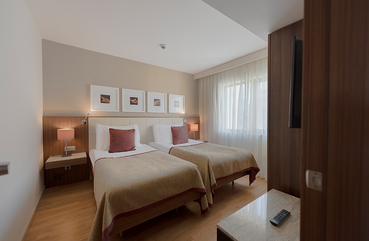 Площадь · 60 м2 · вид на сад или море · душ · туалет · кондиционер · прямой телефон · 2 телевизора спутниковое тв · интернет · фен · мини-бар · чайник:чай - кофе · сейф · полы ламинат · балконом · две отдельные спальни · гостинная · в номерах - одна двуспальная, а в другой-две односпальные кровати · максимум могут разместиться 5 человек.