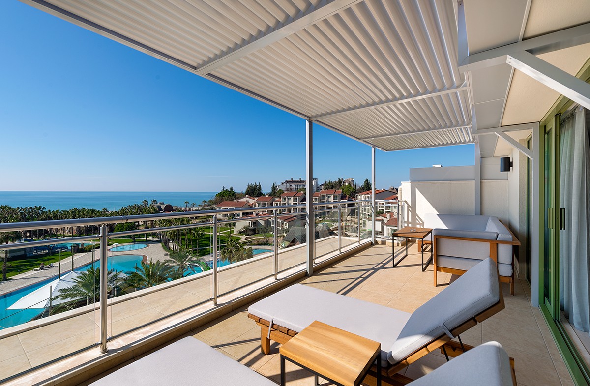 Площадь · 57м2 · расположен на верхнем этаже Arum и предлагает возможность увидеть все Средиземноморье сверху · большой балкон · шезлонги · сиденья · ламинированные полы · система центрального кондиционирования · телефон · меню подушек · мини-бар · халат · тапочки · рабочий стол · балкон · чайник · 24 часа доставка еды и напитков в номер · ванная комната: душ · фен · телефон · керамический пол