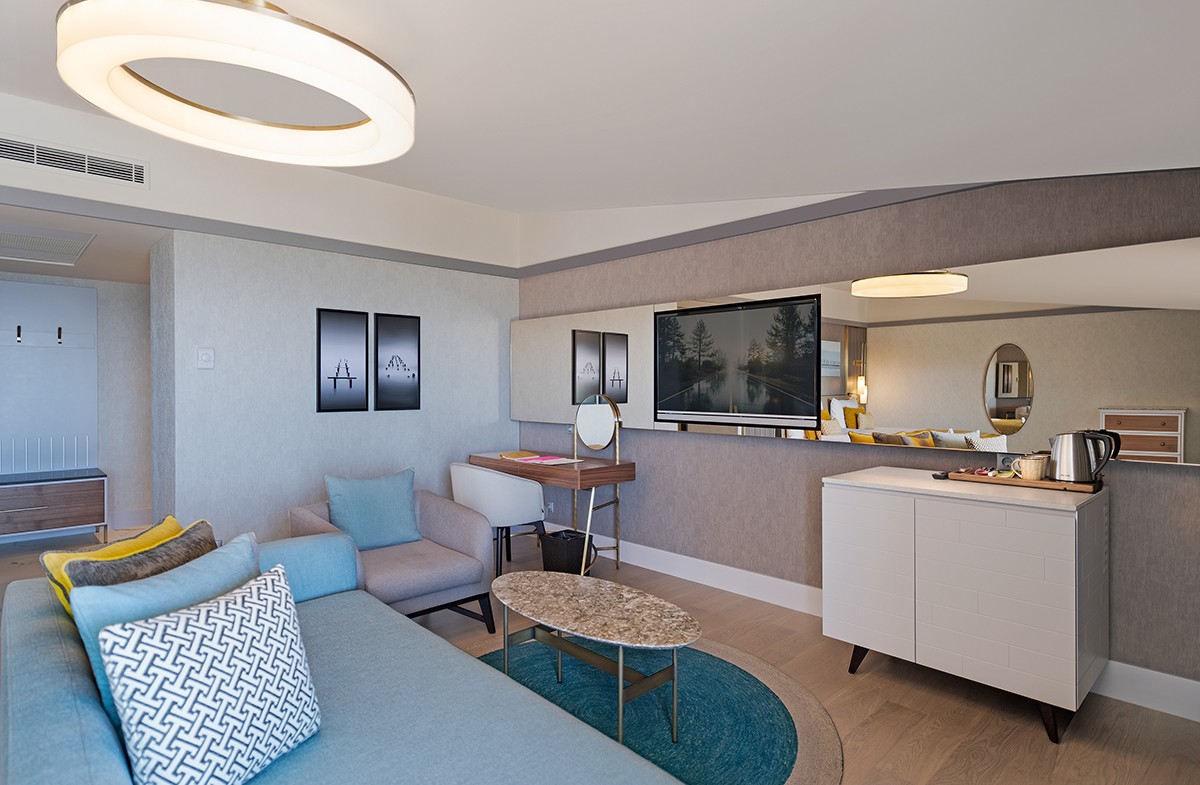 Площадь · 45м2 · с видом на море · балкон · ламинированные полы · гардеробная · система центрального кондиционирования · телефон · ванная комната · душ · халат · тапочки · фен · Wi-Fi ТВ · мини-бар set - up (белое вино, красное вино, Cola, Diet Cola, Cola Zero, Fanta, Sprite, пиво, холодный чай, Сода, соки, вафли) · различные закуски во время пребывания (сухофрукты, крекеры, макароны и т. Д.)
