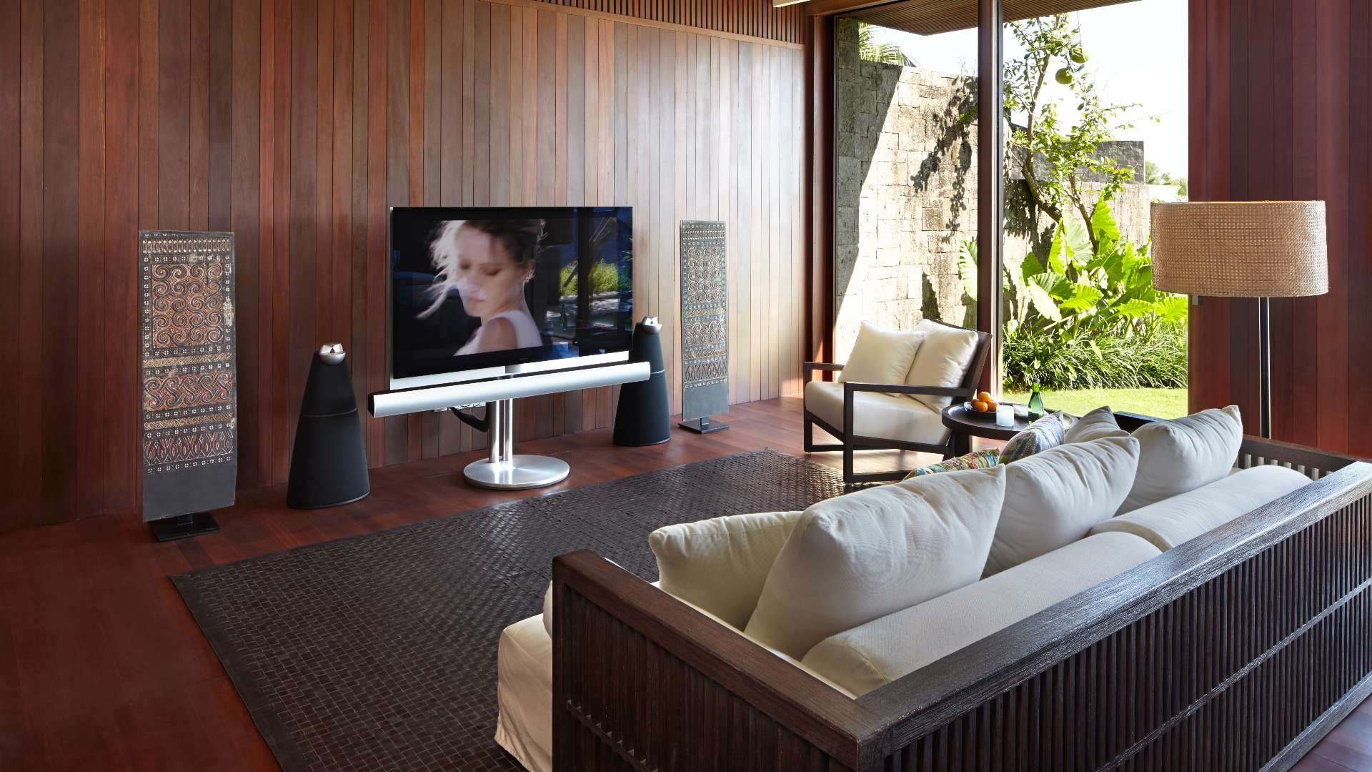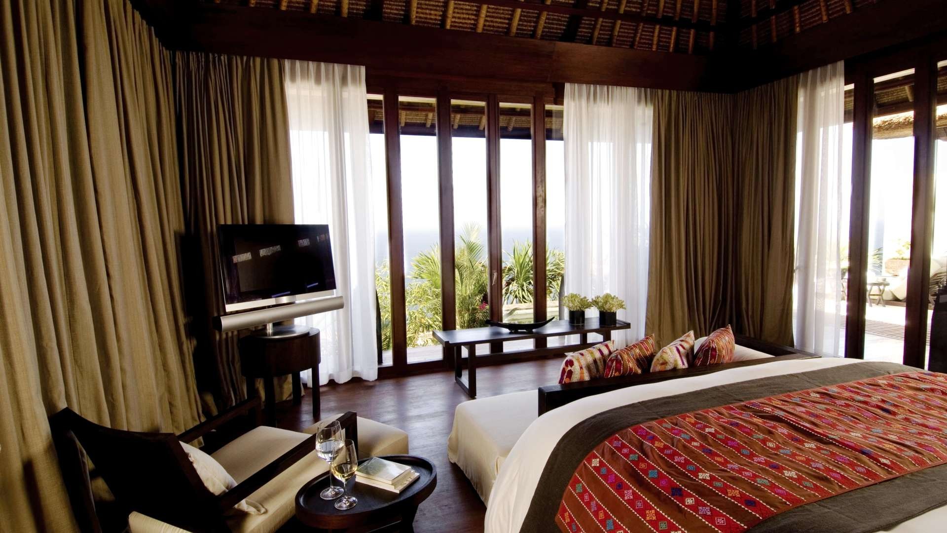 Просторные виллы курортного отеля Bulgari Bali оформлены в традиционном балийском стиле и оборудованы аудио- и видеотехникой фирмы Bang Olufsen. Из стеклянных ванных комнат от пола до потолка открывается вид на собственный внутренний двор.