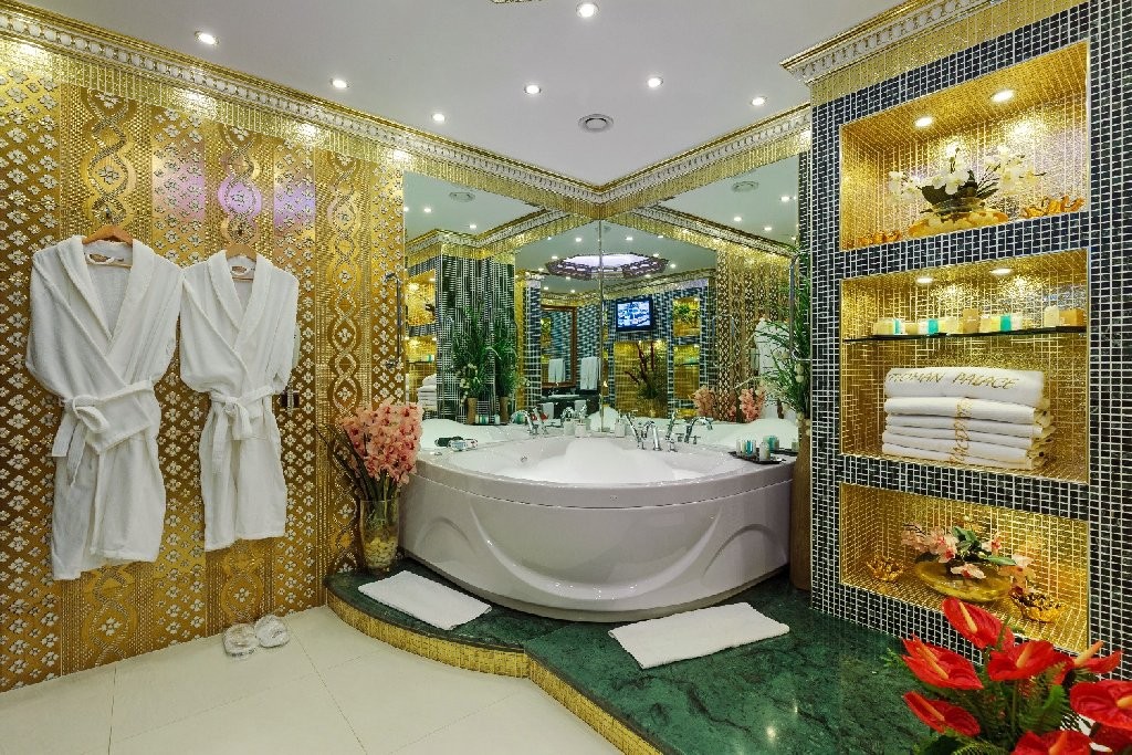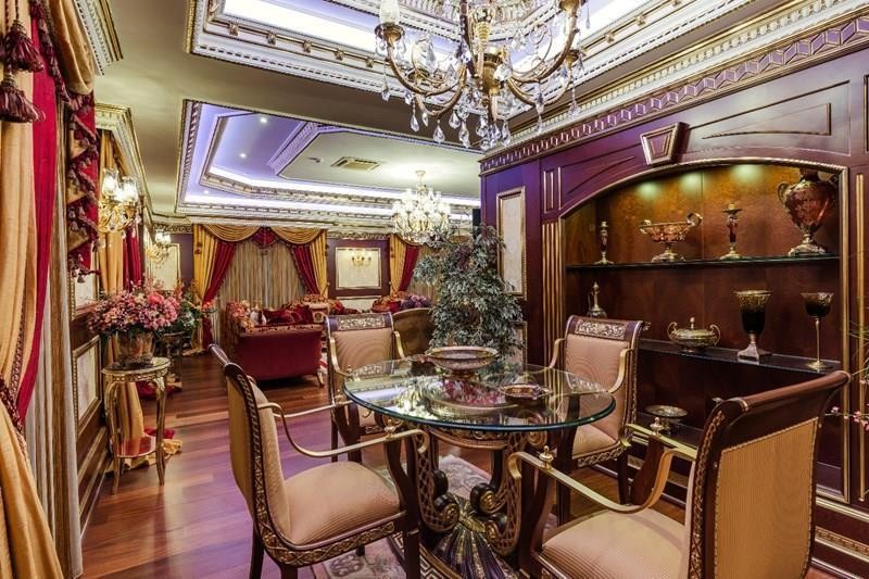 Площадь · 450 m² · состоит из спальной комнаты с кроватью kıng sıze · одной спальной комнаты с двумя односпальными кроватями · разделенными между собой · кабинет · гардеробная · гостинной с мягкой мебелью · столa · кухня · барная стойка · две ванные комнаты (одна - с джакузи) ·прямой телефoн · фен · 3 балкона терраса · сейф · центральный кондиционер · ковровое покрытие
