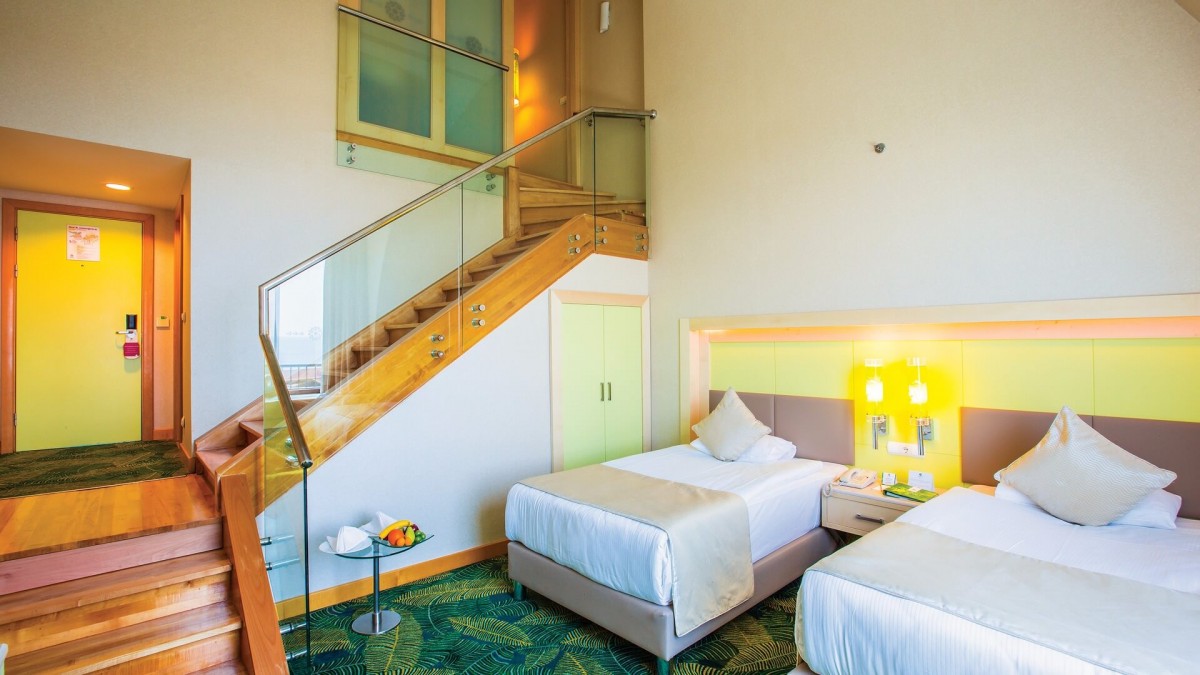 Площадь ·55м2 · частичный вид на море · одна двуспальная и две односпальных кровати · фрукты в день заезда · Мини-бар · чайные и кофейные принадлежности · ванная комната с ванной или душем · махровые халаты и тапочки · фен · сейф · система центрального кондиционирования · телефон с прямой линией · бесплатное беспроводное интернет соединение · платные каналы · плоскоэкранный телевизор со спутниковым и интерактивным вещанием.