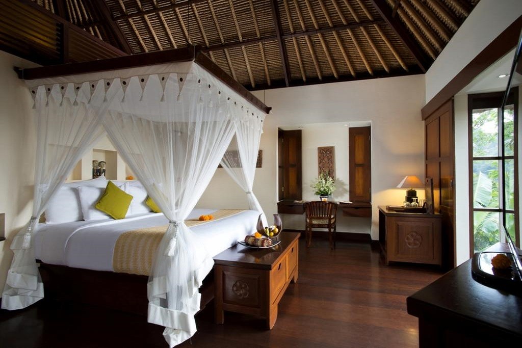 Просторные виллы отеля Hanging Gardens of Bali оформлены в традиционном балийском стиле и располагают большой террасой, телевизором, ванной комнатой с ванной и халатами.