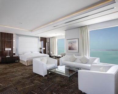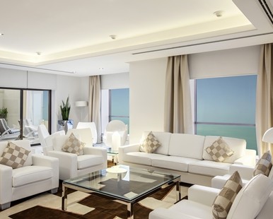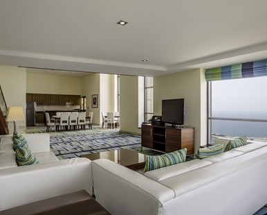 Площадь · 262 квадратных метров • Самый большой номер с видом на море, это четырех-комнатная квартира, расположена на верхнем этаже отеля. В квартире две больших спальни и ванных комнаты • размещение 8 взрослых и 4 детей • 2 балкона • кабинет • гостиная • кухня • холодильник • прачечная • 37-дюймовый ЖК-телевизор • гардеробная • Wi-Fi