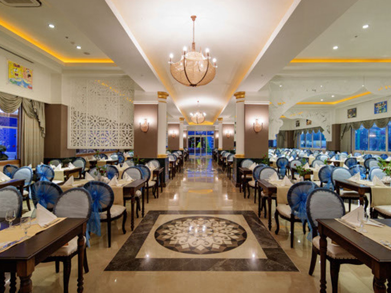Блюда в ресторане и барах всегда свежие и очень вкусные. Всегда большой выбор фруктов: апельсины, яблоки, груши, грейпфруты, персики, арбузы, черешня, клубника, абрикосы. Предлагают даже суши и шаурму. Для детей в свободном доступе в холодильнике стоят йогурты «Растишка» и айран. Главный ресторан отличается красивым интерьером с эксклюзивными стульями и белоснежной посудой. На завтрак и ужин гости приходят одетые по дресс-коду. Обед подают у бассейна, чтобы люди имели возможность поесть, не переодеваясь из купальников. В кофейне у бассейна можно поживиться сладеньким. 9 A'la Carte ресторанов: османский, азиатский, мексиканский, рыбный, детский; дары моря и стейк-хаус, VIP завтрак, итальянский и барбекю (платные)