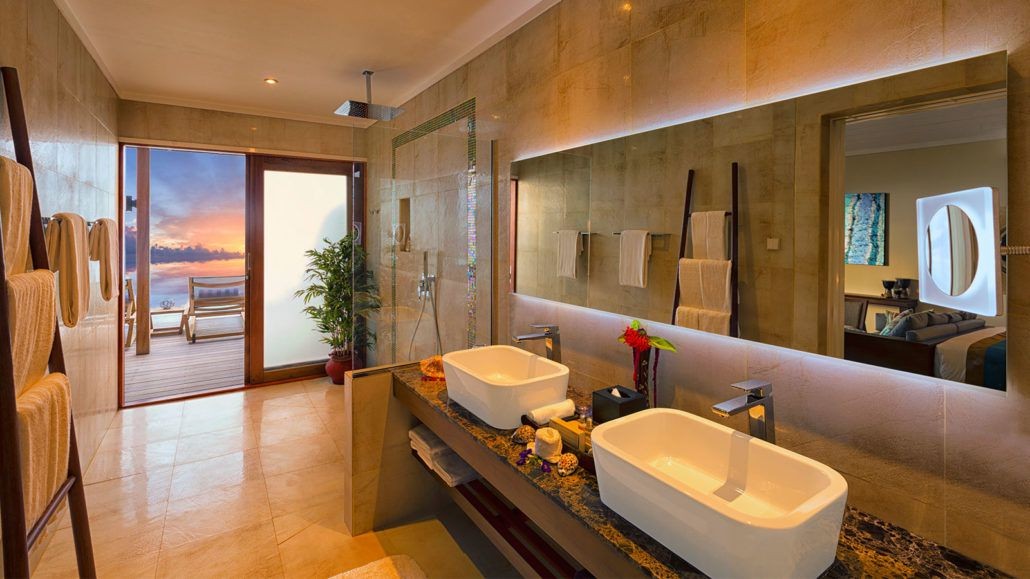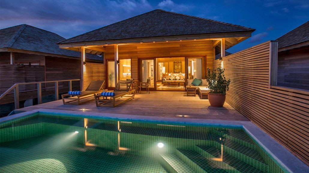 Площадь · 132 квадратных метров • Терраса с открытым персональным бассейном • Обеденной зоной на открытом воздухе и спуском в воду • Спальня с гостиной зоной (кровать king-size) • Ванная комната с душевой кабиной с функцией «тропический дождь» • Расположены на сваях над водой • Вид на рассвет • Кондиционер • Вентилятор • Телевизор • DVD-плеер • Wi-Fi доступ в Интернет • Телефон • Мини-бар • Винный холодильник • Кофемашина • Оборудование для приготовления чая и кофе • Сейф • Фен • Халаты • Тапочки