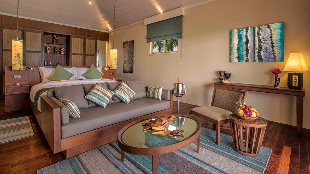 Площадь · 105 квадратных метров • Терраса с обеденной зоной на открытом воздухе и спуском в воду • Спальня с гостиной зоной (кровать king-size) • Ванная комната с душевой кабиной с функцией «тропический дождь» • Расположены на сваях над водой • Вид на океан • Кондиционер • Вентилятор • Телевизор • DVD-плеер • Wi-Fi доступ в Интернет • Телефон • Мини-бар • Винный холодильник • Кофемашина • Оборудование для приготовления чая и кофе • Сейф • Фен • Халаты • Тапочки