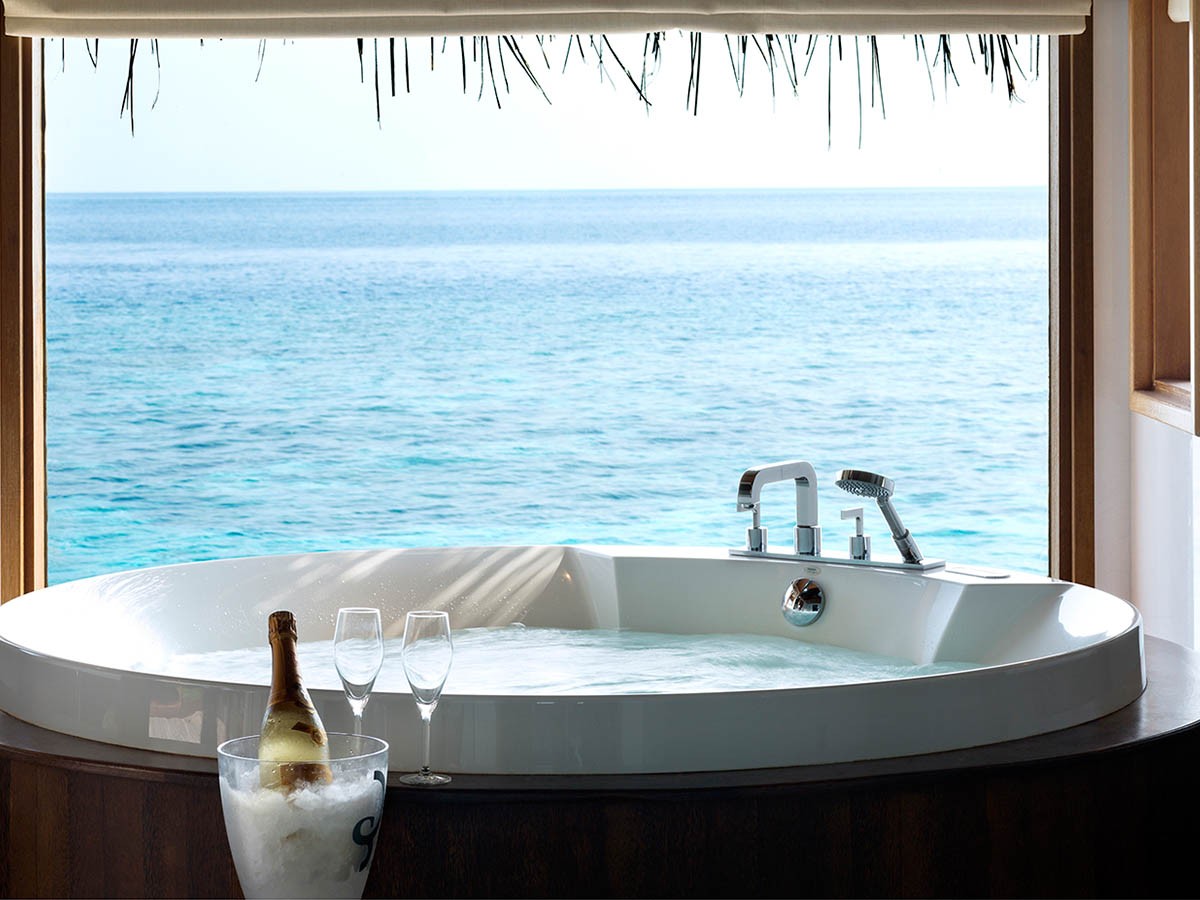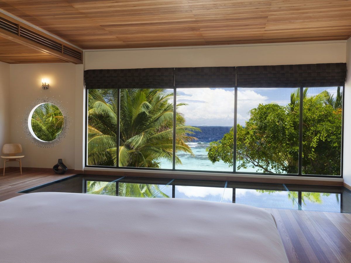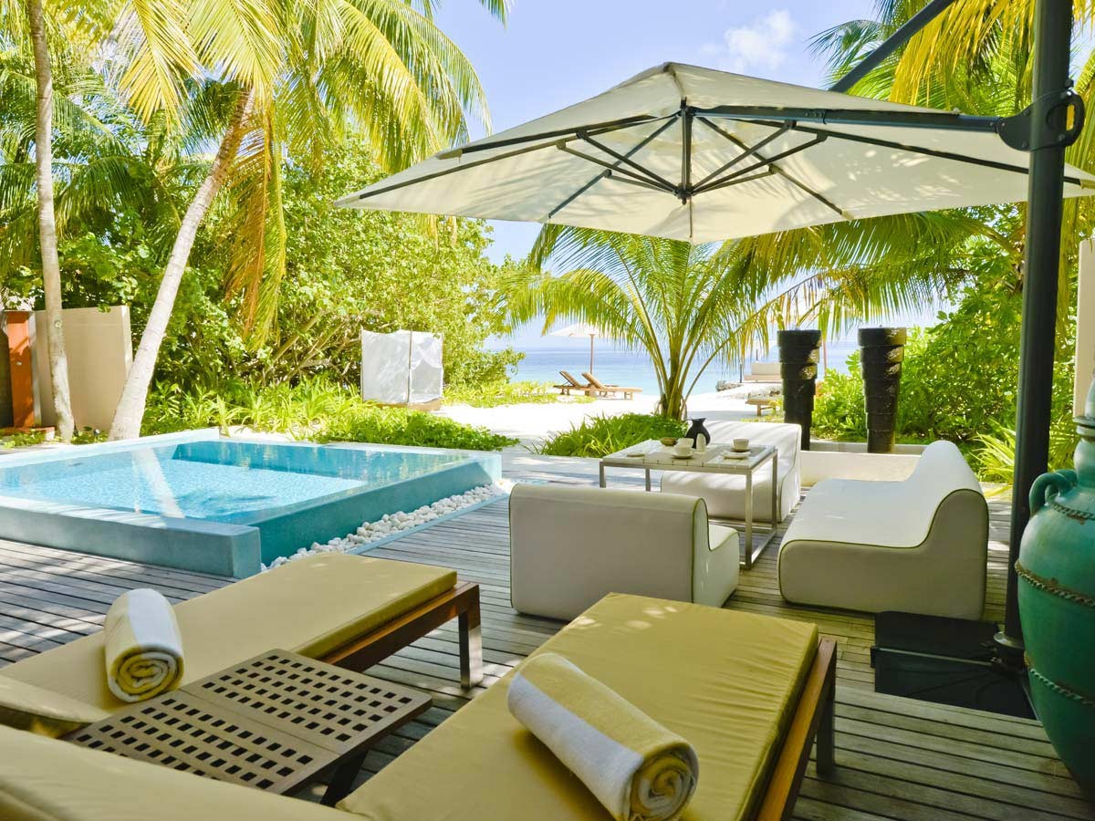 Площадь · 160 квадратных метров • Собственный бассейн • Собственная трехуровневая терраса с кушетками • Ступеньки, ведущие с вашей террасы прямо в Индийский океан • Ванная комната с видами на океан, просторная ванна с гидромассажем и ливневый душ • Мультимедийная система с плазменным телевизором, объемным звучанием • Бунгало с видом на восход над водой • Услуги личного дворецкого («такуру»)