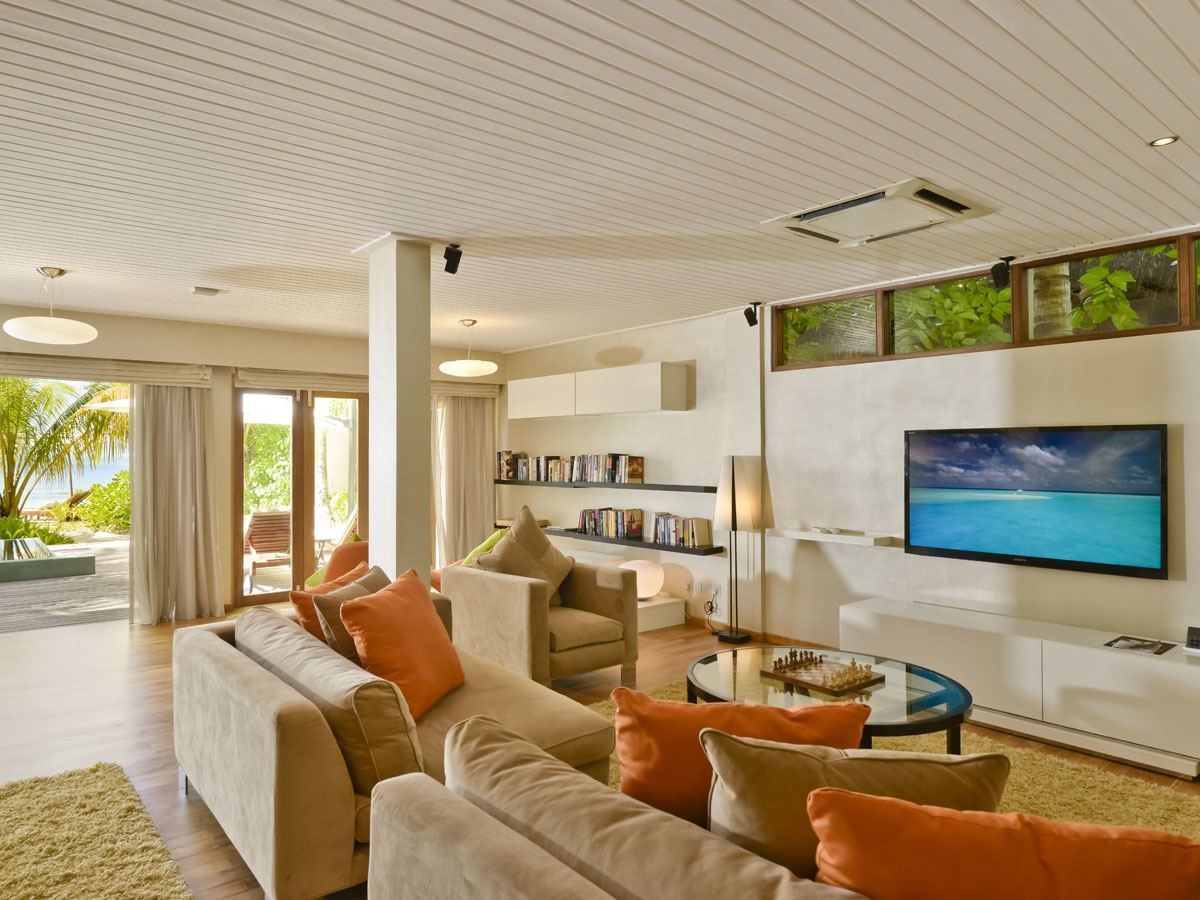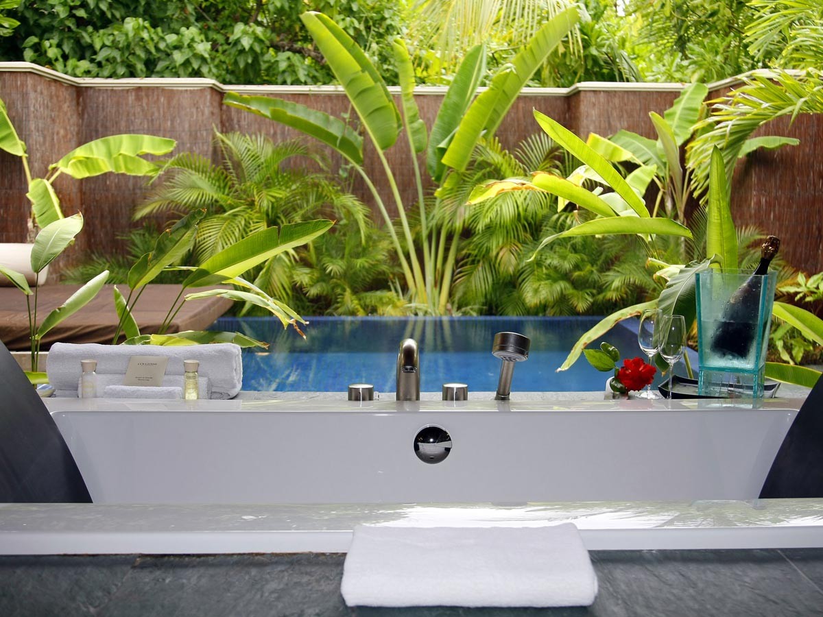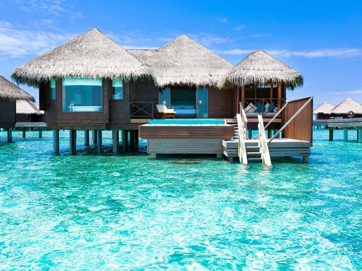 Площадь · 160 квадратных метров • Собственный бассейн • Собственная трехуровневая терраса с кушетками • Ступеньки, ведущие с вашей террасы прямо в Индийский океан • Ванная комната с видами на океан, просторная ванна с гидромассажем и ливневый душ • Мультимедийная система с плазменным телевизором, объемным звучанием • Бунгало с видом на восход над водой • Услуги личного дворецкого («такуру»)