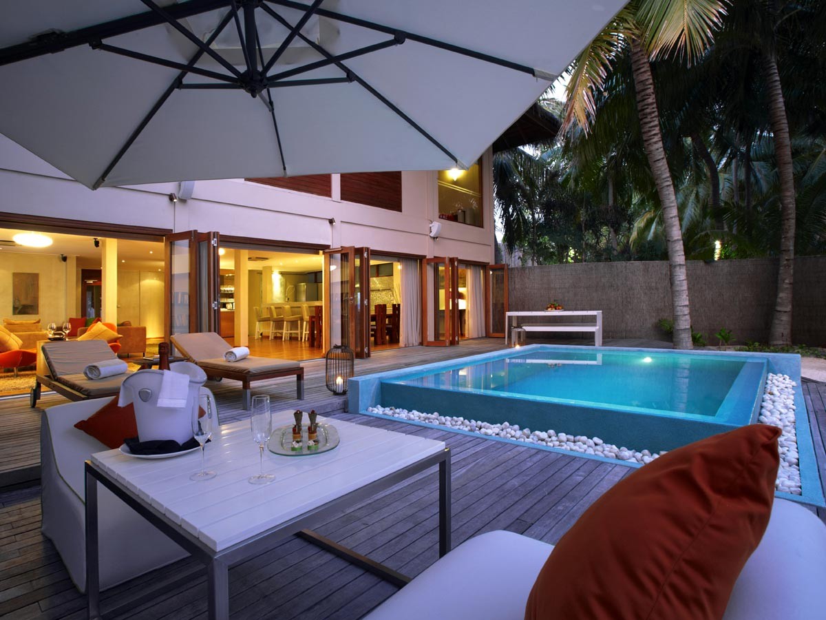 Площадь · 130 квадратных метров • Собственный бассейн • Собственная двухъярусная терраса с беседкой для отдыха и кушеткой • Ступеньки, ведущие с вашей террасы прямо в Индийский океан • Мультимедийная система с плазменным телевизором, объемным звучанием • Бунгало с видом на восход и на лагуну • Услуги личного дворецкого («такуру»)