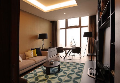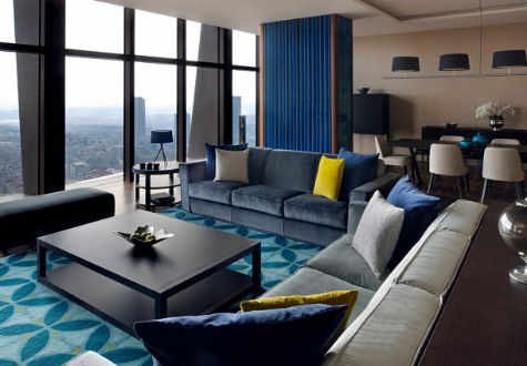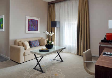 Площадь · 45 квадратных метров • Вид на город • Гостиная зона • Кондиционер • Панорамные окна • Кровати 1 King и софа • Биде • Фен • Тапочки • Сейф • Рабочий стол • Утюг и гладильная доска • Чай и кофе • Мини бар • Телефон • Интернет • Телевизор 42» • Радио • Привилегии Executive lounge