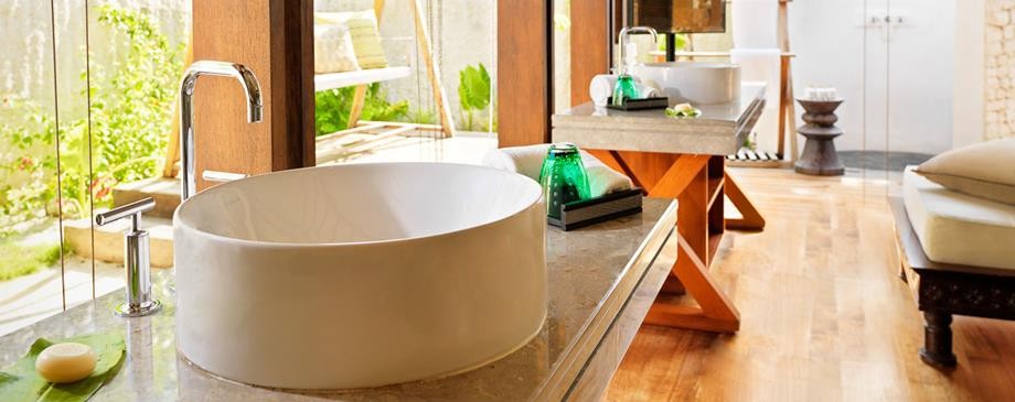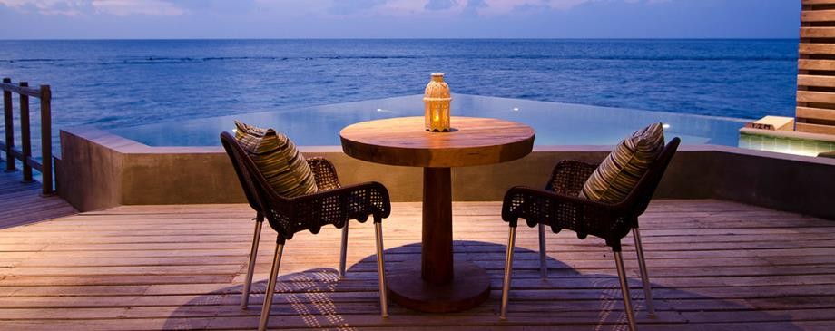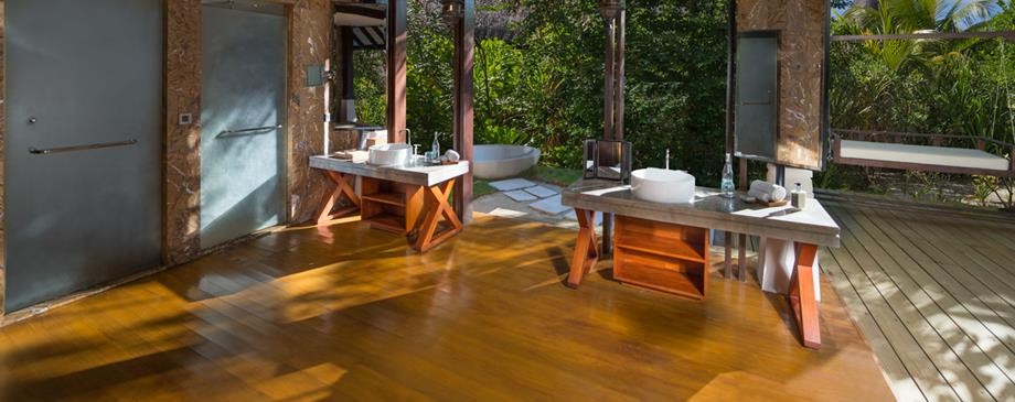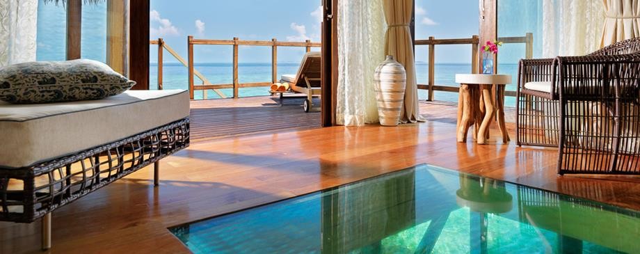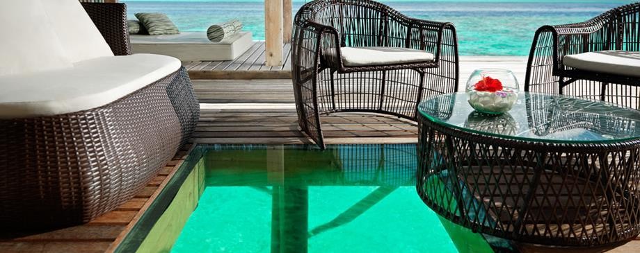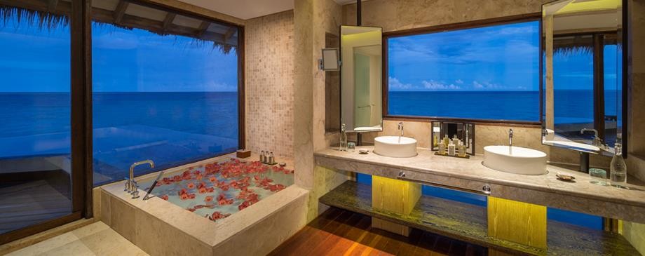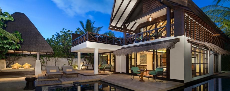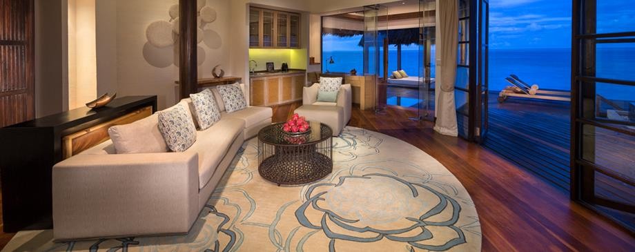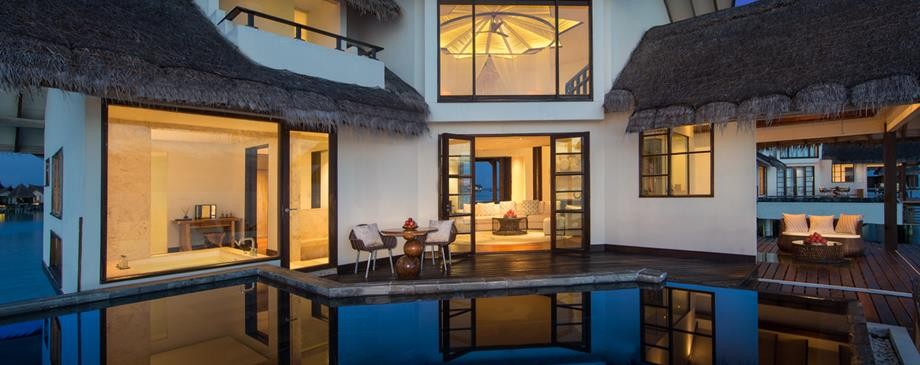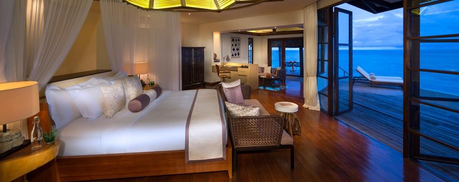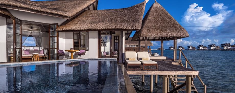 Площадь · 200 квадратных метров • Терраса с открытым персональным бассейном • Спальня с гостиной зоной (кровать king-size) • Ванная комната с ванной и душем c функцией «тропический дождь» на открытом воздухе • Расположены на сваях над водой • Вид на лагуну и океан • Спуск в воду • Телевизор • WI-FI доступ в Интернет • Док-станция для iPod • Сейф • Мини-бар • Оборудование для приготовления чая и кофе • Утюг • Фен