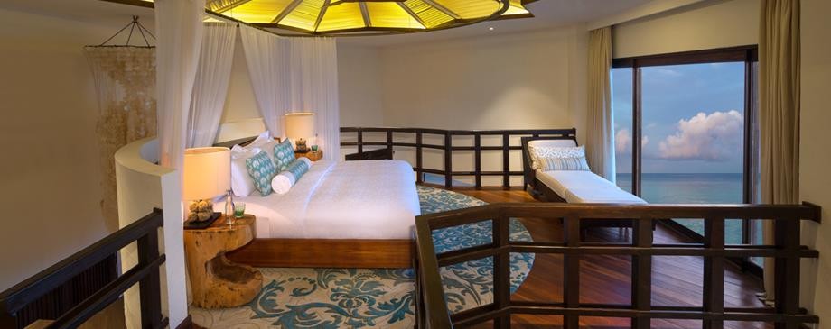 Площадь · 256 квадратных метров • Двухуровневый номер • Терраса с открытым персональным бассейном • Спальня с гостиной зоной (кровать king-size) • Ванная комната с ванной • Душ с функцией «тропический дождь» на открытом воздухе • Вид на закат • Телевизор • WI-FI доступ в Интернет • Док-станция для iPod • Сейф • Мини-бар • Оборудование для приготовления чая и кофе • Утюг • Фен