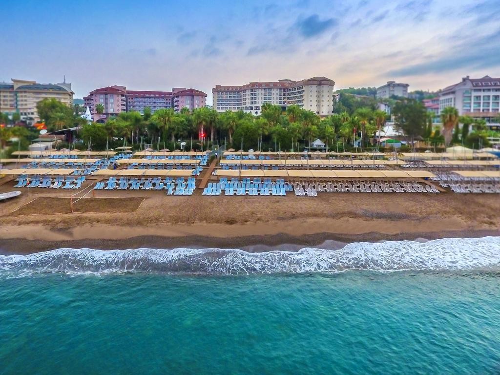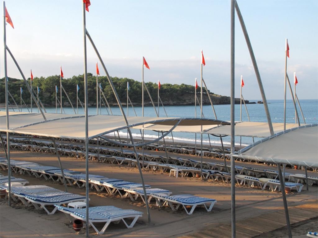 Песчаный пляж изумительной чистоты и красоты принадлежит отелю (голубой флаг, первая береговая линия, 200 м от отеля). Зонтики, полотенца, лежаки гостям предоставляются бесплатно. На территории пляжа есть бар, поэтому в любой момент можно перекусить и выпить. Для переодевания оборудованы раздевалки и душевые.