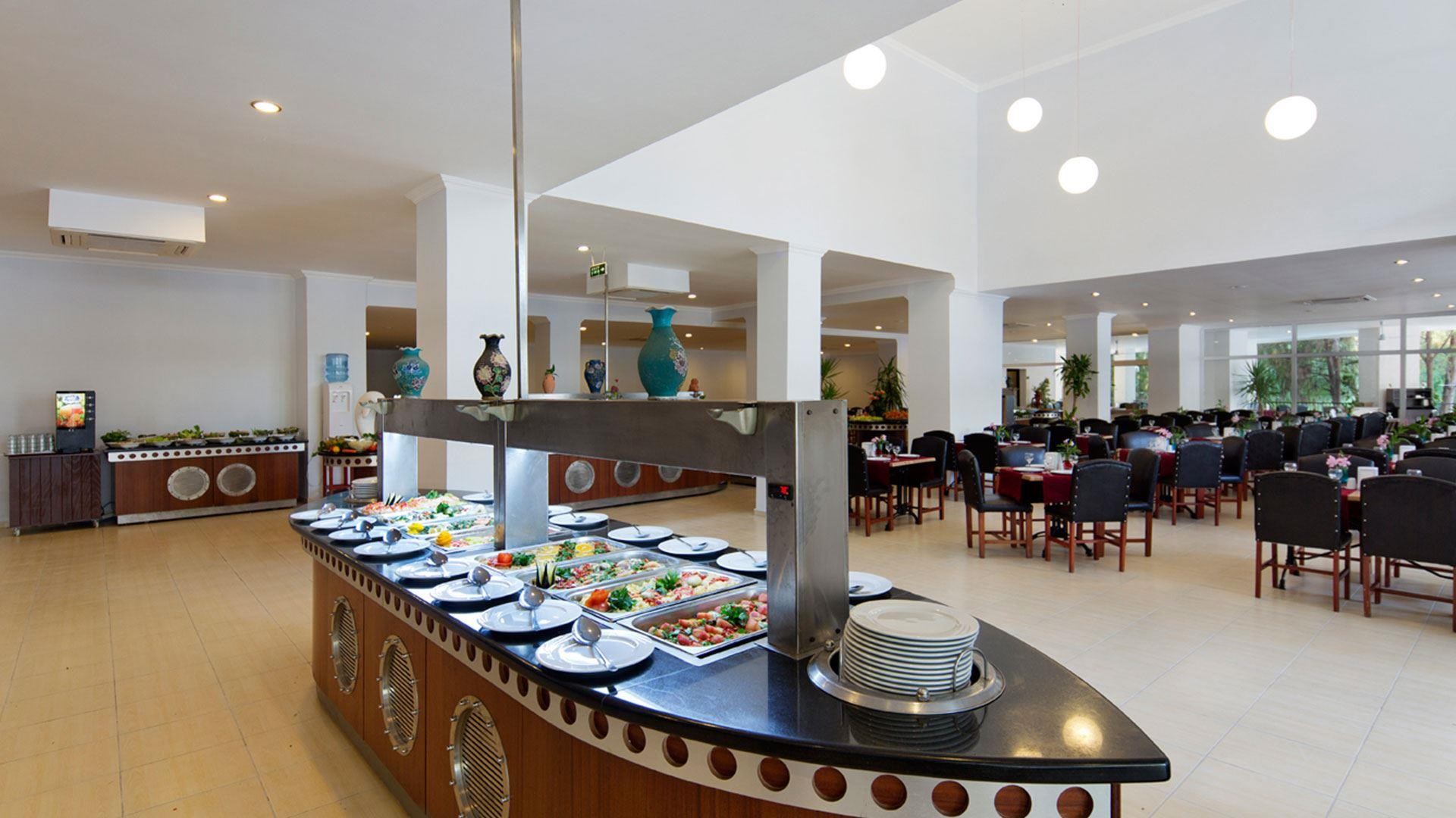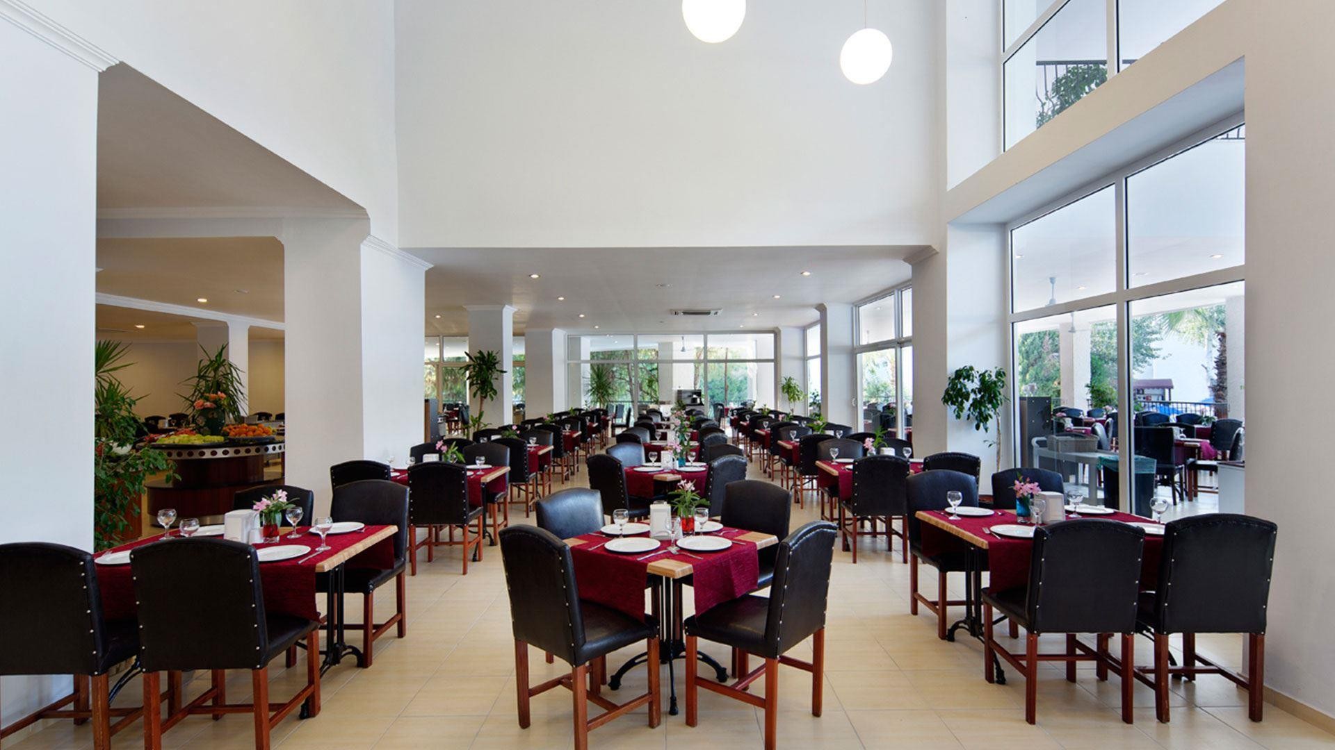 В просторном главном ресторане доступно питание по системе «шведский стол». Концепция «все включено» распространяется на все напитки и продукты с 10 утра и до 12 ночи. Питание стандартное для отеля четырехзвездочного уровня: рыба и курица, приготовленные различными способами, свежие и тушеные овощи, обилие салатов и закусок, несколько видов фруктов, супы-пюре, разнообразные гарниры (в том числе пресные, без приправ), огромное количество десертов и сладостей. На завтрак помимо прочего подают разнообразную молочную продукцию, каши, выпечку, яйца в разных видах. Не обошлось здесь и без любимого детьми и подростками фаст-фуда: гамбургеры, хот-доги, картофель фри и т.д. В определенные часы повара готовят шаурму и блюда на гриле. Утром в главном ресторане подают молоко и горячие напитки, во время обеда и ужина — прохладительные и алкогольные напитки.