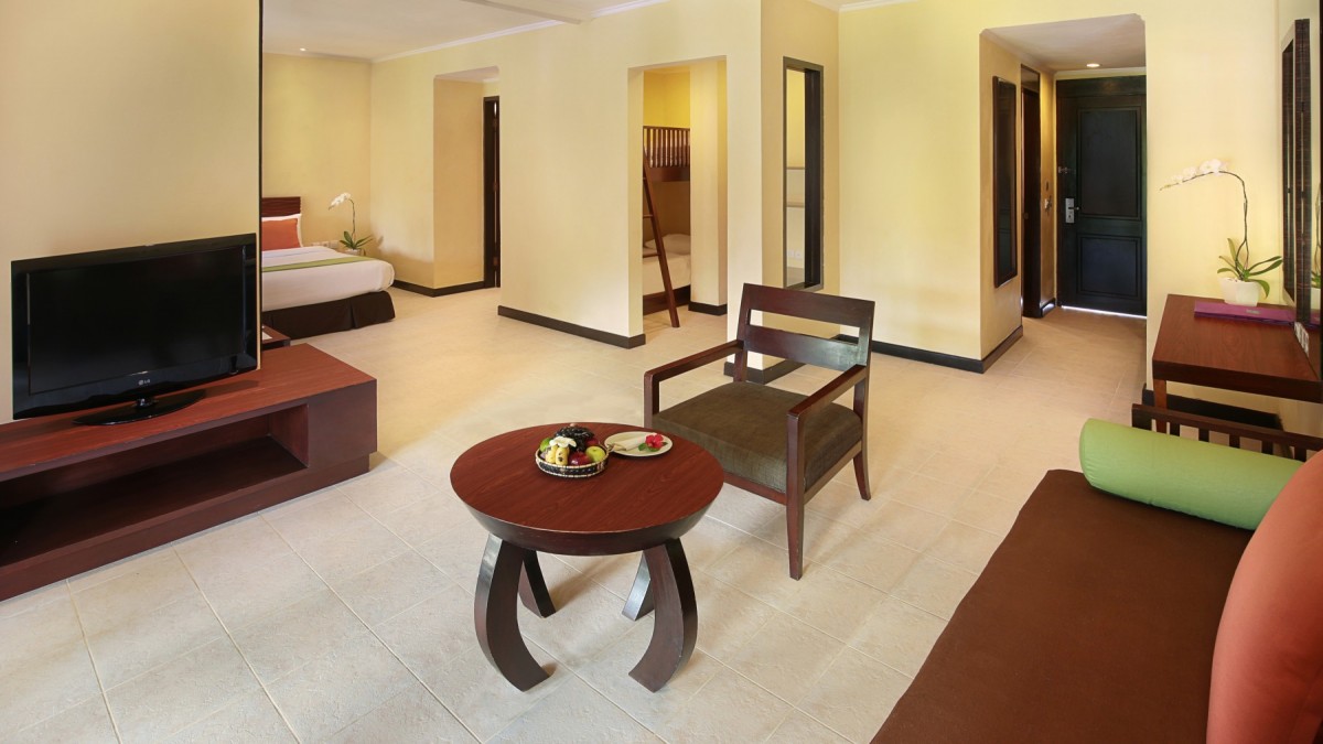 Площадь · 88 квадратных метров • Люкс с большой двуспальной кроватью. Главная спальня, гостиная и вторая спальня с двухъярусной кроватью разделены дверьми. В номере вас ждут все удобства Mercure, великолепная мебель и стильные ванные комнаты с традиционными балийскими элементами • Кондиционер • План эвакуации • Минеральная вода в номере бесплатно • Телефон • Wi-Fi в Вашем номере • Письменный стол в каждом номере • Цветное спутниковое/кабельное ТВ • Мини-бар • Автоматы для приготовления кофе/чая