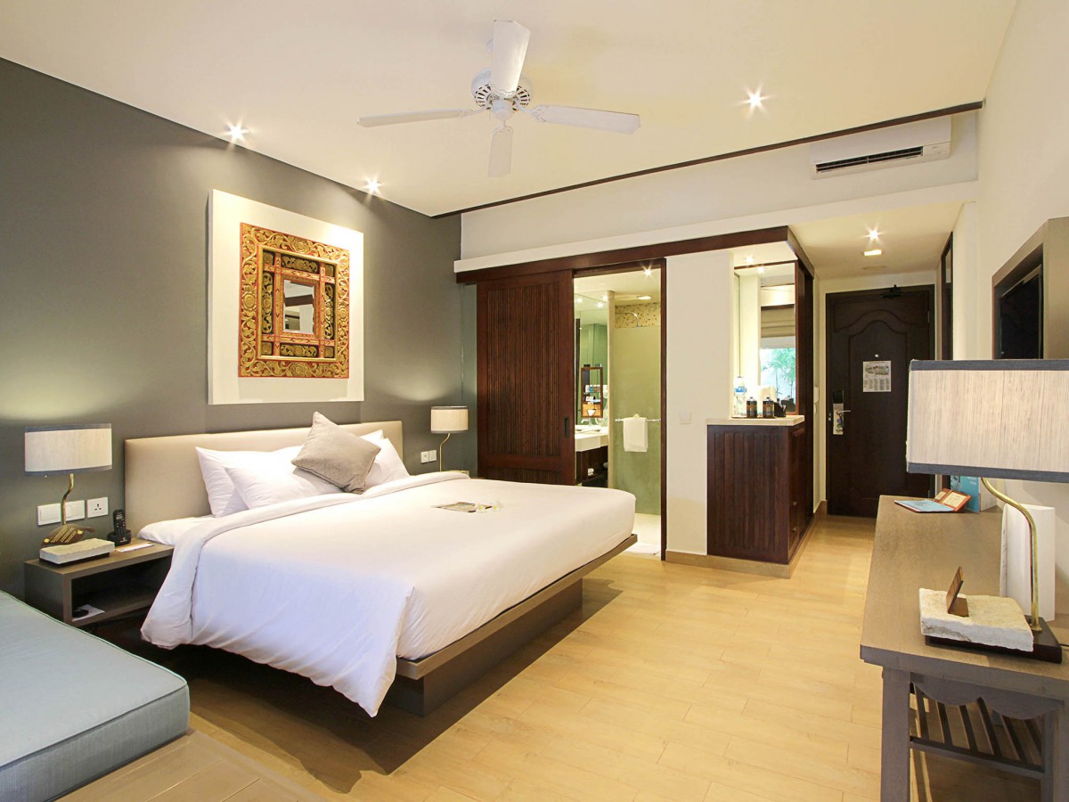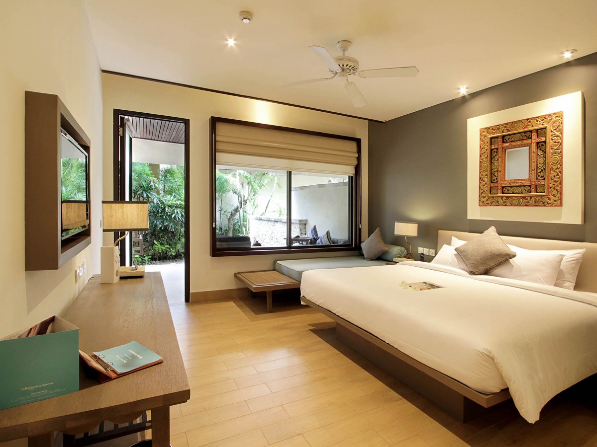 Номера отеля Novotel Benoa со вкусом обставлены мебелью из темного дерева и располагают собственным балконом, телевизором со спутниковыми каналами, сейфом и гостиным уголком. Из номеров открывается вид на тропический сад.