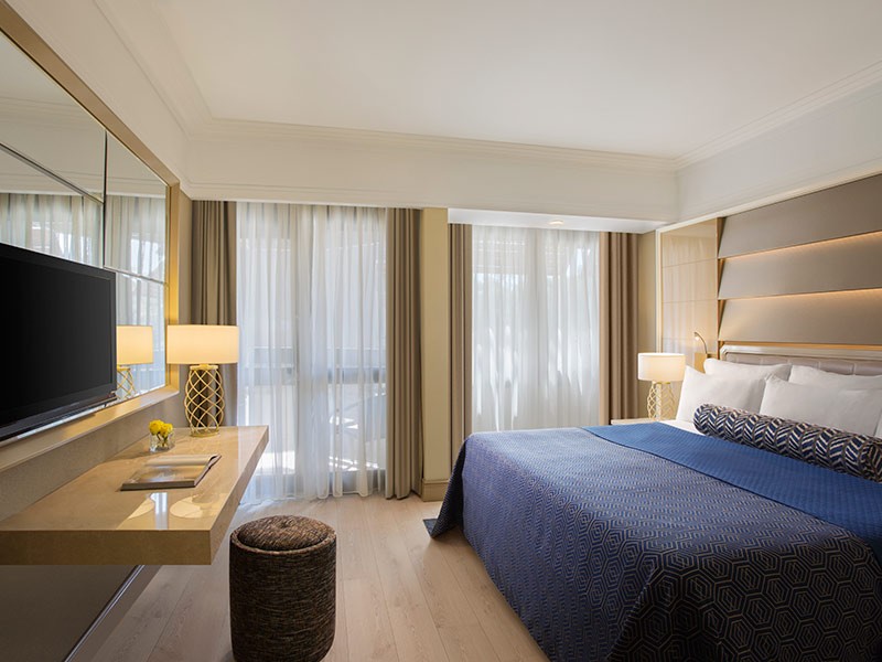 Площадь · 45 м2 · просторный балкон · пол керамическая плитка · центральная система кондиционирования · Номер состоит из гостиной с мягкой мебелью (2 софы в качестве спального места) и спальни с двуспальной кроватью или двумя односпальными кроватями на выбор · телефон · HD ТВ · фен · душ · мини-бар · стол и набор для приготовления чая и кофе · В номерах работает беспроводной интернет · Подготовка номера ко сну · В день заезда вино и фрукты