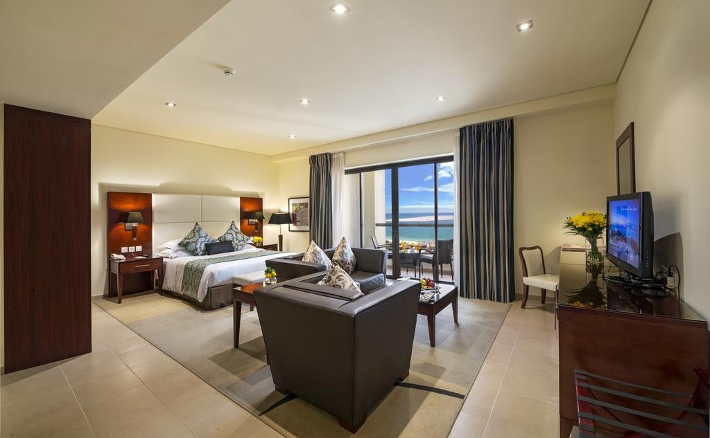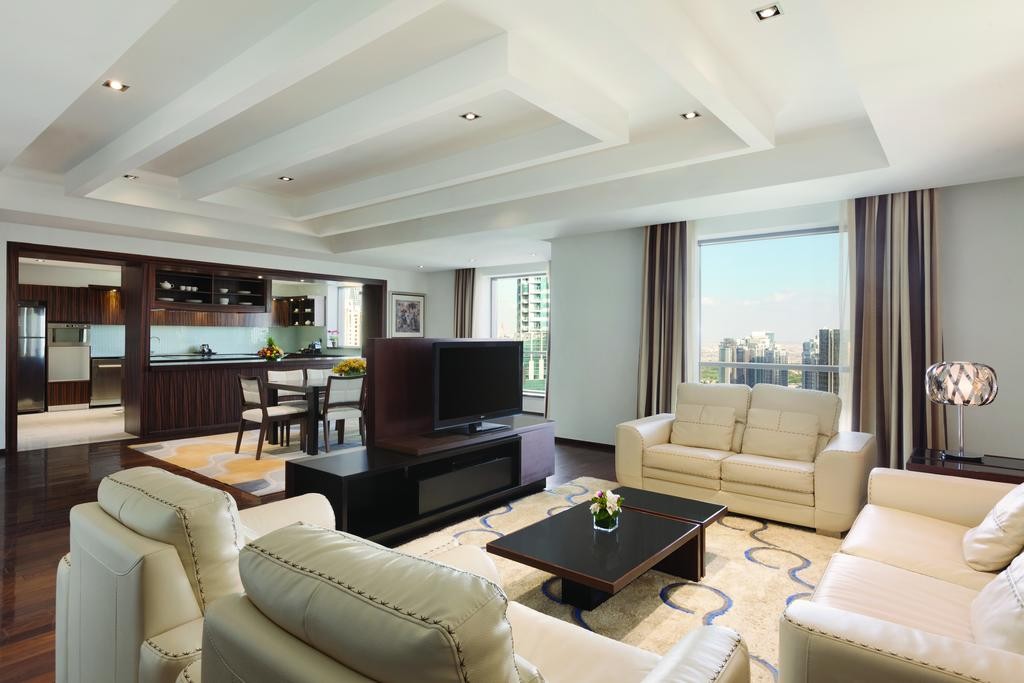 В роскошных номерах отеля Ramada Plaza Jumeirah Beach установлены большие французские окна. В каждом люксе есть просторная гостиная с обеденной зоной и телевизором с плоским экраном, а также кухня с посудой, микроволновой печью и плитой.
