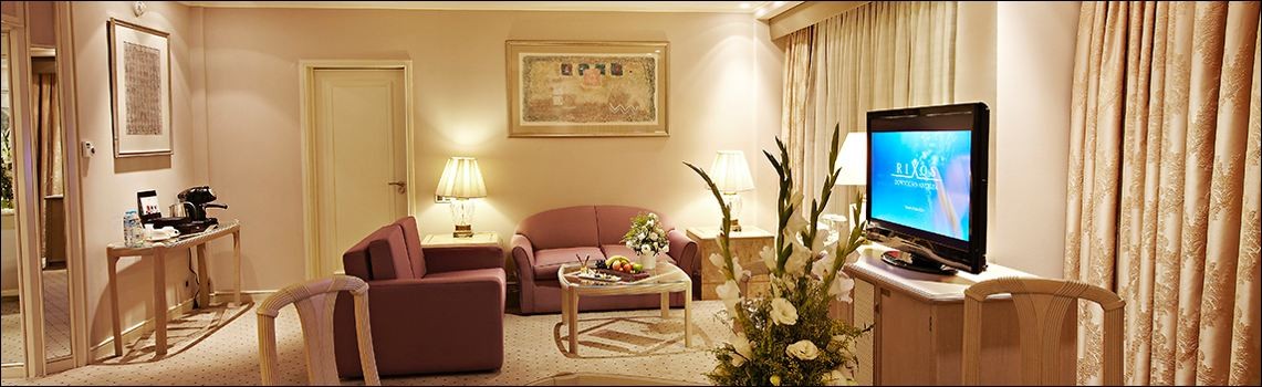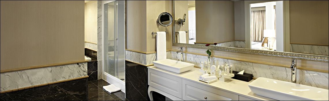 Площадь номера · 128м2 · 2 спальные комнаты · 1 гостиная · 2 ванные комнаты · две отдельные или одна большая (king size) кровать · мини-бар · централизованное кондиционирование · сейф · ковровое покрытие · душ · туалет · Зеркало для макияжа · фен · для мужчин и женщин подготовлены отдельные наборы средств гигиены · LCD ТВ · спутниковое телевидение · подключение к интернету · телефон