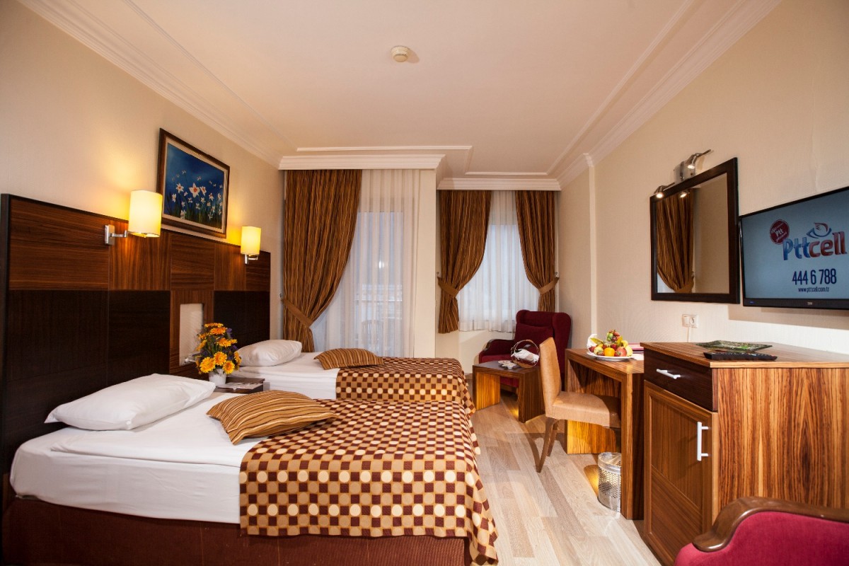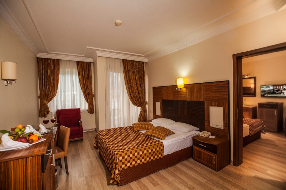 Площадь номера · 28 кв.м · просторный однокомнатный номер · 1 спальня (одна двуспальная кровать · одна односпальная и раскладное кресло или доп. кровать для ребенка) · центральный кондиционер (работает в зависимости от погодных условий) · мини-бар (вода, прохладительные напитки – пополнение ежедневно) · LED телевизор · спутниковое ТВ с каналами на русском языке (6 каналов) · музыкальный канал · прямой телефон · ванна или душевая · фен · тапочки · электронный сейф (бесплатно) · Wi-Fi (платно) · балкон.