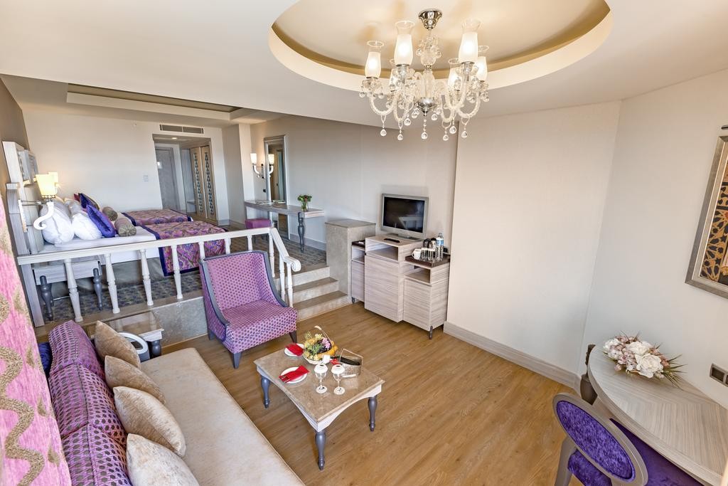 Площадь номера · 137м2 · двух этажный номер · две спальные комнаты и гостиная · в каждой комнате душ и санузел · в спальной комнате джакузи · центральный кондиционер (работает в определенные часы, в зависимости от погодных условий) · мини-бар (вода, безалкогольные напитки и пиво - пополнение ежедневно) · спутниковое ТВ с российским каналом · музыкальный канал · прямой телефон · ванна · фен · халаты (платно)/тапочки (бесплатно) · чайник · набор для приготовления чая и кофе · меню подушек (платно) · балкон · сейф (бесплатно)