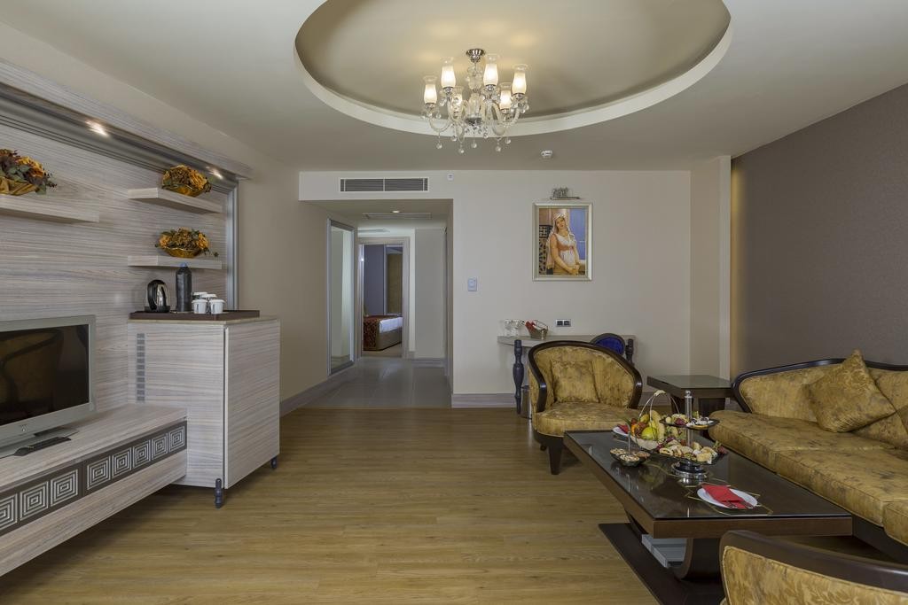 Площадь номера · 70м2 · одна спальная комната и гостиная · в каждой комнате душ и санузел · в спальной комнате джакузи · центральный кондиционер (работает в определенные часы, в зависимости от погодных условий) · мини-бар (вода, безалкогольные напитки и пиво - пополнение ежедневно) · спутниковое ТВ с российским каналом · музыкальный канал · прямой телефон · ванна · фен · халаты (платно)/тапочки (бесплатно) · чайник · набор для приготовления чая и кофе · меню подушек (платно) · балкон · сейф (бесплатно)
