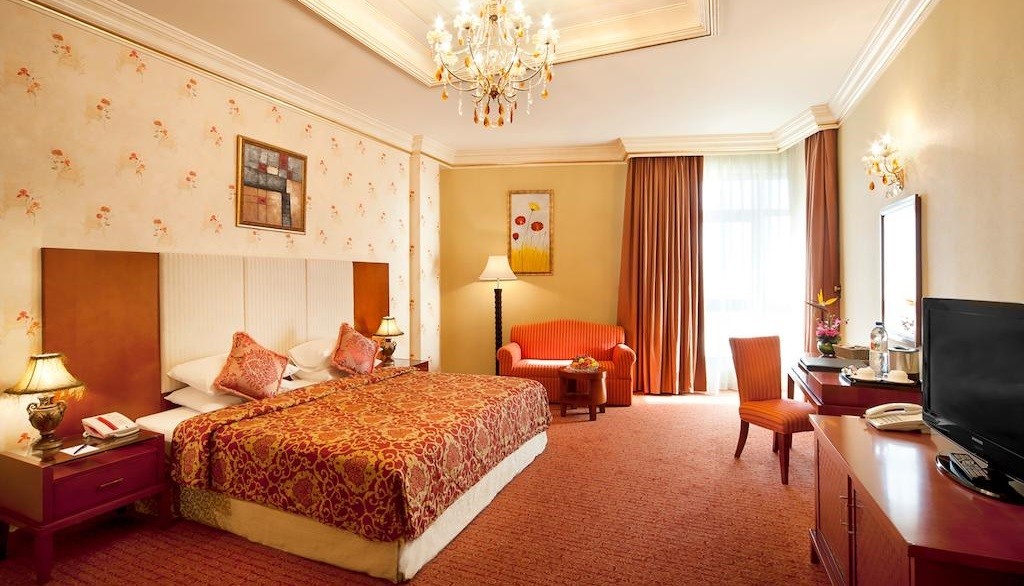 Номера курортного спа-отеля Royal Beach богато украшены люстрами и оформлены в теплых тонах. В числе удобств — диван и телевизор с плоским экраном. В некоторых номерах есть большие окна с видом на море.