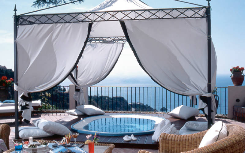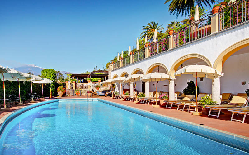 Этот роскошный отель состоит из 2 исторических зданий в городе Таормина. Крыло отеля в саду занимает здание бывшего монастыря XV века с клуатром. Крыло «Гранд-отель» было пристроено в 1896 году.