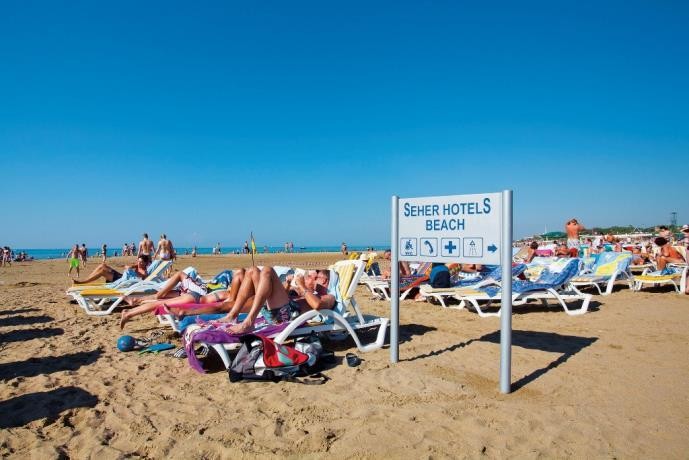 Расстояние до одного из лучших средиземноморских пляжей — всего 200 метров. Здесь гости могут бесплатно пользоваться зонтами и шезлонгами. Сам пляж — песчаный, чистый и пологий, вход в море плавный, поэтому дети могут спокойно резвиться в воде, не боясь глубины. С 10 часов утра на пляже начинает работать бар, в котором можно взять любые напитки и легкие закуски (сендвичи, лепешки и т. д.).