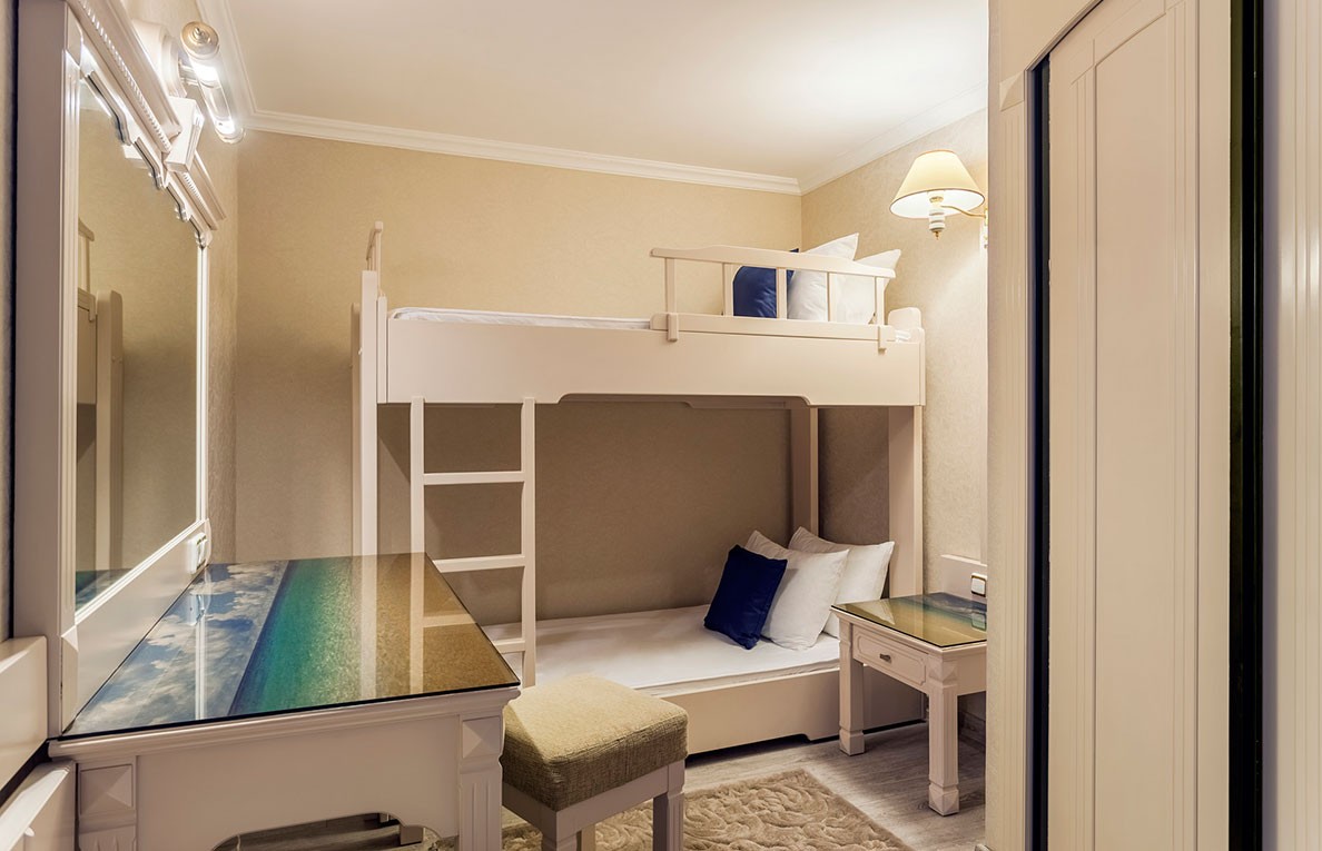 Площадь · 62м2 · В номере две спальни · гостиная и ванная комната · 1-я комната с двухспальной кроватью · 2-я комната с двухъярусной кроватью, в салоне диван-кровать. · Душ-Туалет · Прямая телефонная связь · Центральное кондиционирование · ЖК-телевизор · Фен · Мини бар · Набор чая и кофе · Сейф · Ламинат · Балкон. (Из них 50 номеров с двухъярусной кроватью. Двухспальная и двухъярусная кровати и диван)