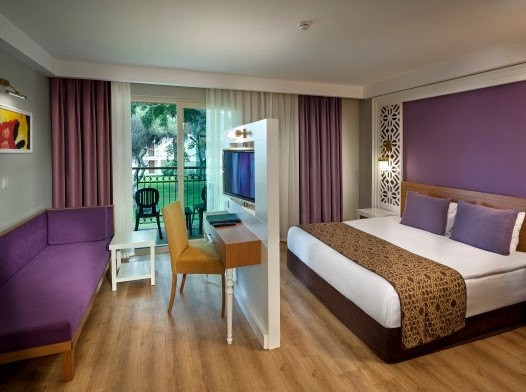 Площадь · 29 m² · 1 двуспальная кровать (twin или french) · 1 софа · ванная комната (душ) балкон с видом на бассейн · Центральное кондиционирование (работает по расписанию) · Мини Бар · Чайный и кофейный набор · Wi-fi · Спутниковое телевидение (Лед экран/ диагональю 82 см) · Музыка из телевизора · Сейф(бесплатно) · Телефон с прямым выходом на внешнюю линию · Ванная (с душем · Банный гигиенический набор · Tуалет · Фэн · Балкон или терраса · Паркет и керамическое покрытие