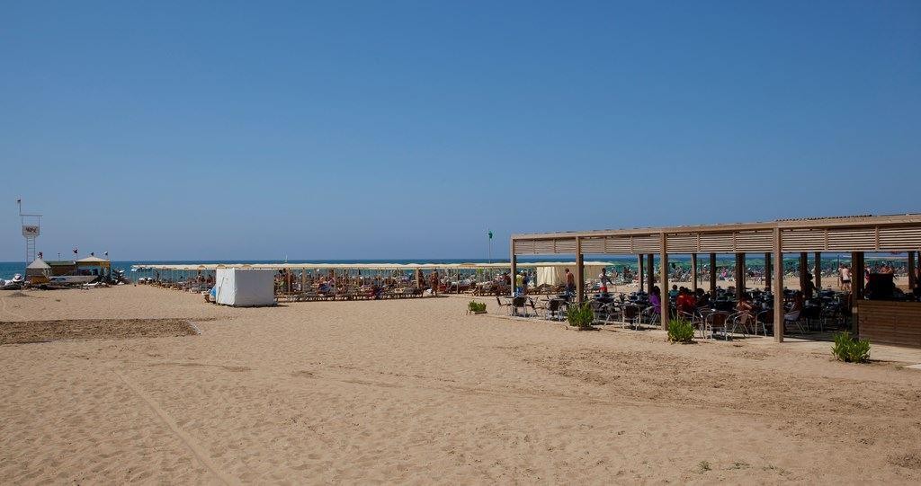 Собственный песчаный пляж находится в 400 м от отеля, через дорогу. Курсирует шаттл на пляж, бесплатно. Шезлонги, зонтики, матрацы — бесплатно, пляжные полотенца — платно. Заход в море — песок. Душ, кабины для переодевания, бар на пляже.