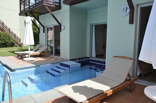 Номера расположены на первом этаже · имеют террасу и джакузи в бассейне · 2 спальные комнаты (в одной – 1 двуспальная кровать · во второй – 2 односпальные кровати) · во всех номерах керамический пол · 2 ванные комнаты (душ) · центральная система кондиционирования · телефон · фен · в двух комнатах спутниковое TV (информационные и музыкальные каналы) · сейф · 2 мини-бара.