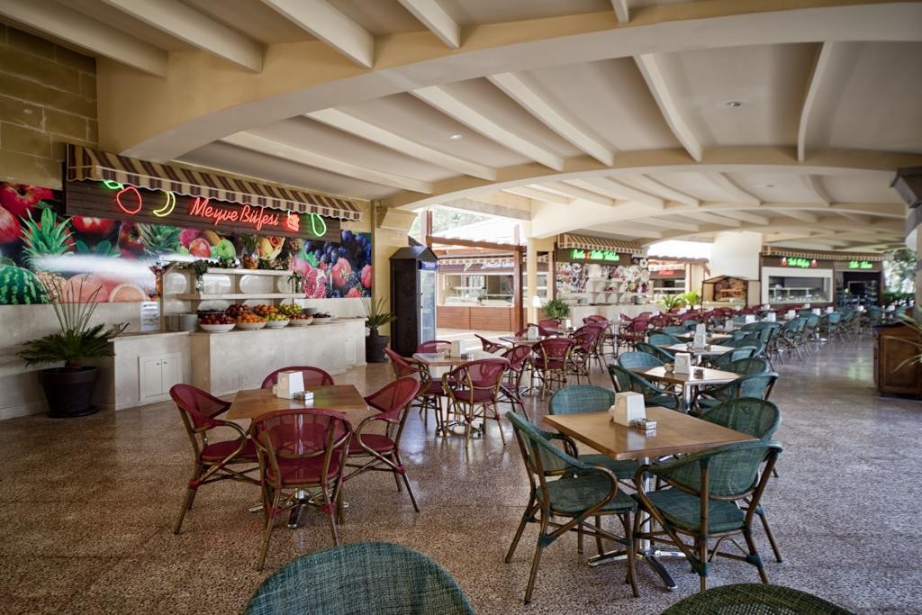 Традиционно большой для Турции выбор мяса и тушёных овощей. Всегда есть картофельное пюре и макароны. Обеды проходят в ресторане на улице. Предлагают несколько видов супов, в том числе чечевичный, томатный и куриный. С 12.30 до 16 устраивается полдник, на котором можно попробовать 5 сортов вкуснейшего мороженого.