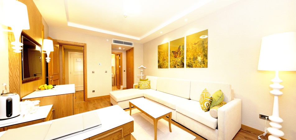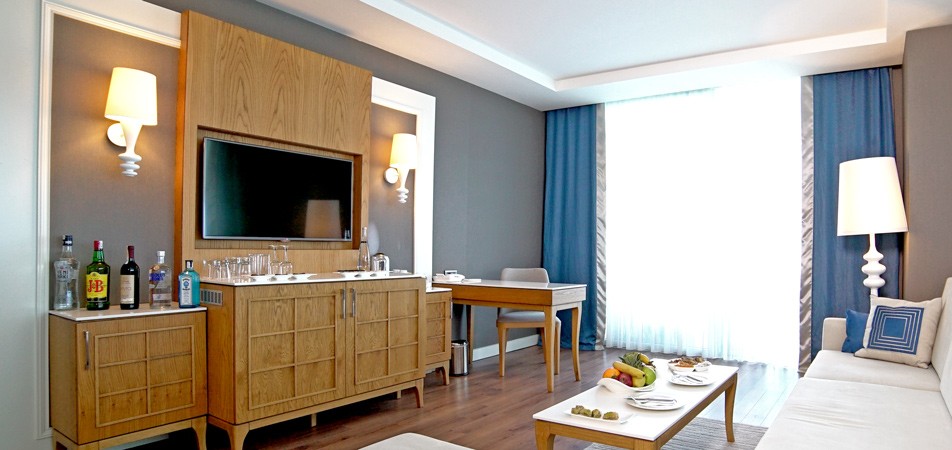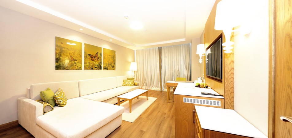 Площадь · 70м2 · две комнаты: одна гостиная и одна спальня · одна двухместная кровать, один раскладной диван и один угловой диван · гардеробная зона и балкон · обогрев и охлаждение номеров происходит через центральную систему кондиционирования воздуха · LCD-телевизор · электронный сейф · фен · ежедневно пополняемый мини-бар · душевая и прямой телефон · беспроводной интернет.