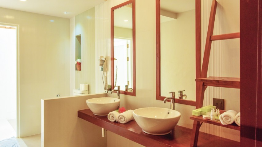 Площадь · 246 квадратных метров • Терраса с джакузи на открытом воздухе • Гостиная с баром • 2 спальни (одна с двуспальной кроватью • Вторая с двумя отдельными кроватями) • 2 ванные комнаты • DVD/CD-плеер • Компьютер • Оборудование для приготовления чая и кофе • Расположены на сваях над водой • Кондиционер • Вентилятор • Спутниковое телевидение • Телефон • Сейф • Мини-бар • Оборудование для приготовления чая и кофе • Кофемашина espresso • Фен