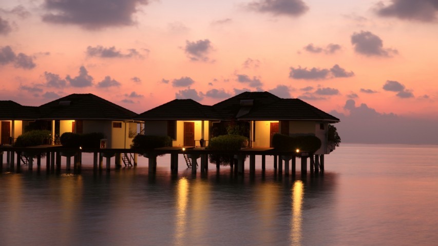 Площадь · 32 квадратных метров • Терраса со спуском в воду • Спальня • Ванная комната с ванной • Расположены на сваях над водой • Кондиционер • Вентилятор • Спутниковое телевидение • Телефон • Сейф • Мини-бар • Оборудование для приготовления чая и кофе • Кофемашина espresso • Фен