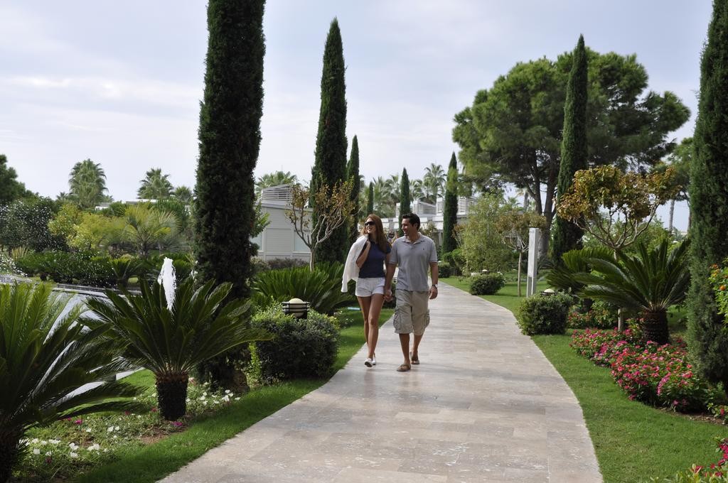 Территория гостиницы восхищает своей необычной архитектурой: хвойные деревья, пальмы и кустарники перемежаются с бассейнами, островами и водными каналами, а все вместе образуют неповторимый ансамбль, прогуливаться по которому — одно удовольствие. На газонах под сенью крон расположены мягкие кресла-мешки и гамаки, где гости отдыхают от палящего солнца и наслаждаются тишиной и пением птиц.