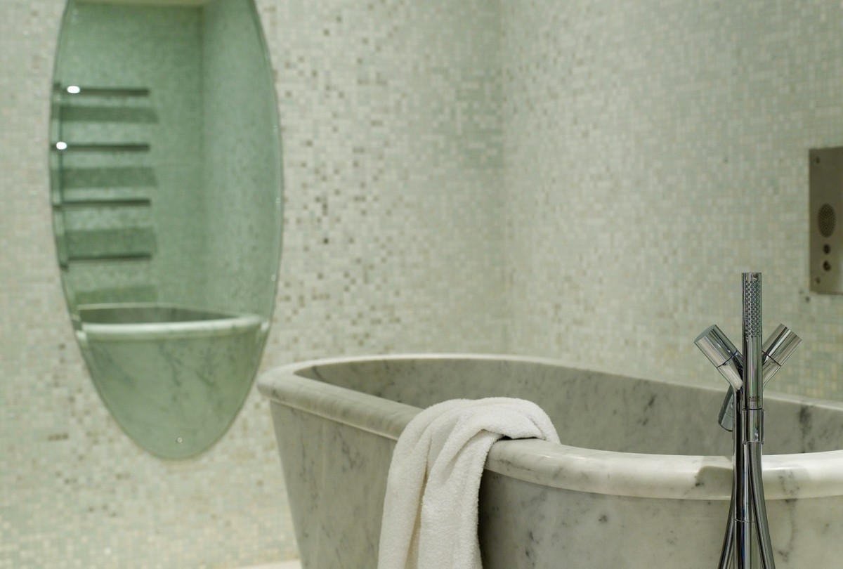 Площадь · 28,5 квадратных метров • Подушки • Одеяла • Мраморная ванная комната с ванной и душем